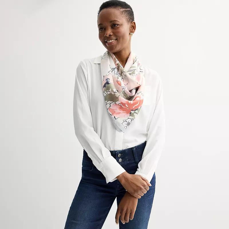 Elevate your style with this womens Nine West square scarf featuring a stunning floral design that seamlessly blends elegance and versatility. This luxurious scarf is the perfect accessory to add a pop of color and sophistication to any outfit, making it an essential addition to your wardrobe.Elevate your style with this womens Nine West square scarf featuring a stunning floral design that seamlessly blends elegance and versatility. This luxurious scarf is the perfect accessory to add a pop of color and sophistication to any outfit, making it an essential addition to your wardrobe. How do you accessorize? Check out our ACCESSORIES GUIDE for essential tips to elevate your style with must-have accessories.FEATURES 42 x 42 Lightweight Square scarfFABRIC & CARE Polyester Hand wash Imported Size: One Size. Color: Ivory Neutral. Gender: female. Age Group: adult. Pattern: floral print.