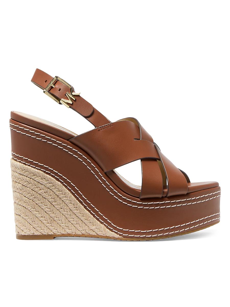 Crafted of leather, these Nora platform sandals from MICHAEL Michael Kors are set atop a 125mm jute-wrapped wedge heel with contrast stitching. Open toe Buckle closure Leather upper Polyurethane/viscose/polyester lining Rubber sole Imported SIZE Wedge heel: about 5 (125mm) Platform: about 1.5 (40mm). Womens Shoes - Contemporary Shoes > Michael Michael Kors > Saks Fifth Avenue > Barneys. MICHAEL Michael Kors. Color: Luggage. Size: 8.