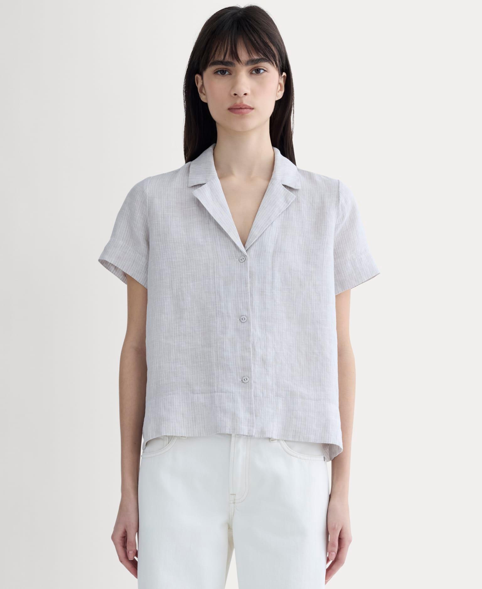 Meet the Linen Short-Sleeve Notch Shirt. This piece features a relaxed fit short sleeve notch collar and button closure in linen. Womens Notch Shirt in Linen by Everlane in Stone/White, Size 2XS