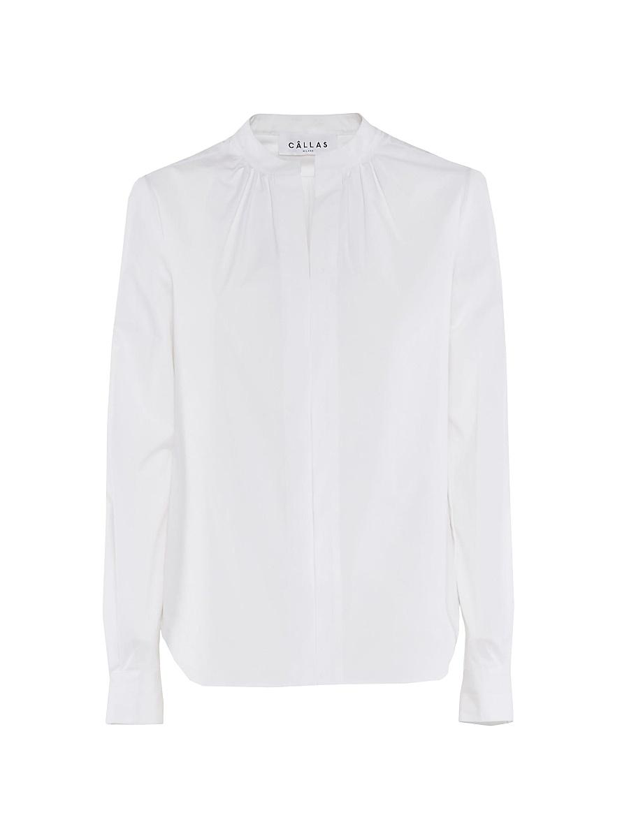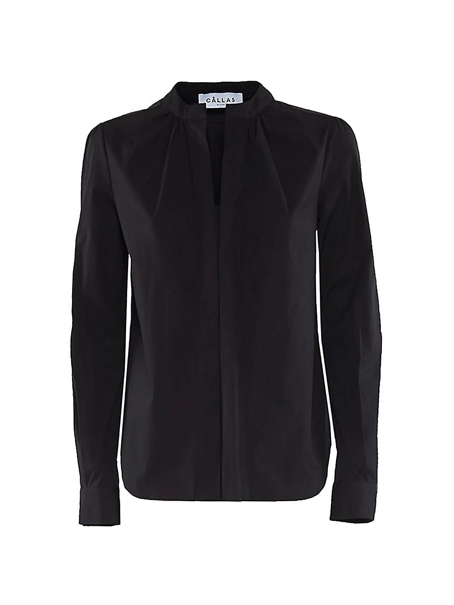 The long-sleeved, poplin Olympia blouse is a staple top for casual and more elevated wear. Cut with a relaxed frame that allows movement without losing the feminine structure, the Olympia top is the polished number for any occasion. The classic button cuffs add a touch of elegance to the sleeves while the buttonless front placket and small band collar lend a modernist appeal. 97%Cotton 3%Elastane Italian Responsibly Sourced Poplin Professional dry cleaning recommended. hhhh Made in Italy SIZE & FIT Order your usual size Classic fit. Lsd Rtw - Womens Rtw Lsd Mp > Callas Milano > Saks Fifth Avenue > Barneys. Callas Milano. Color: Black. Size: 2.