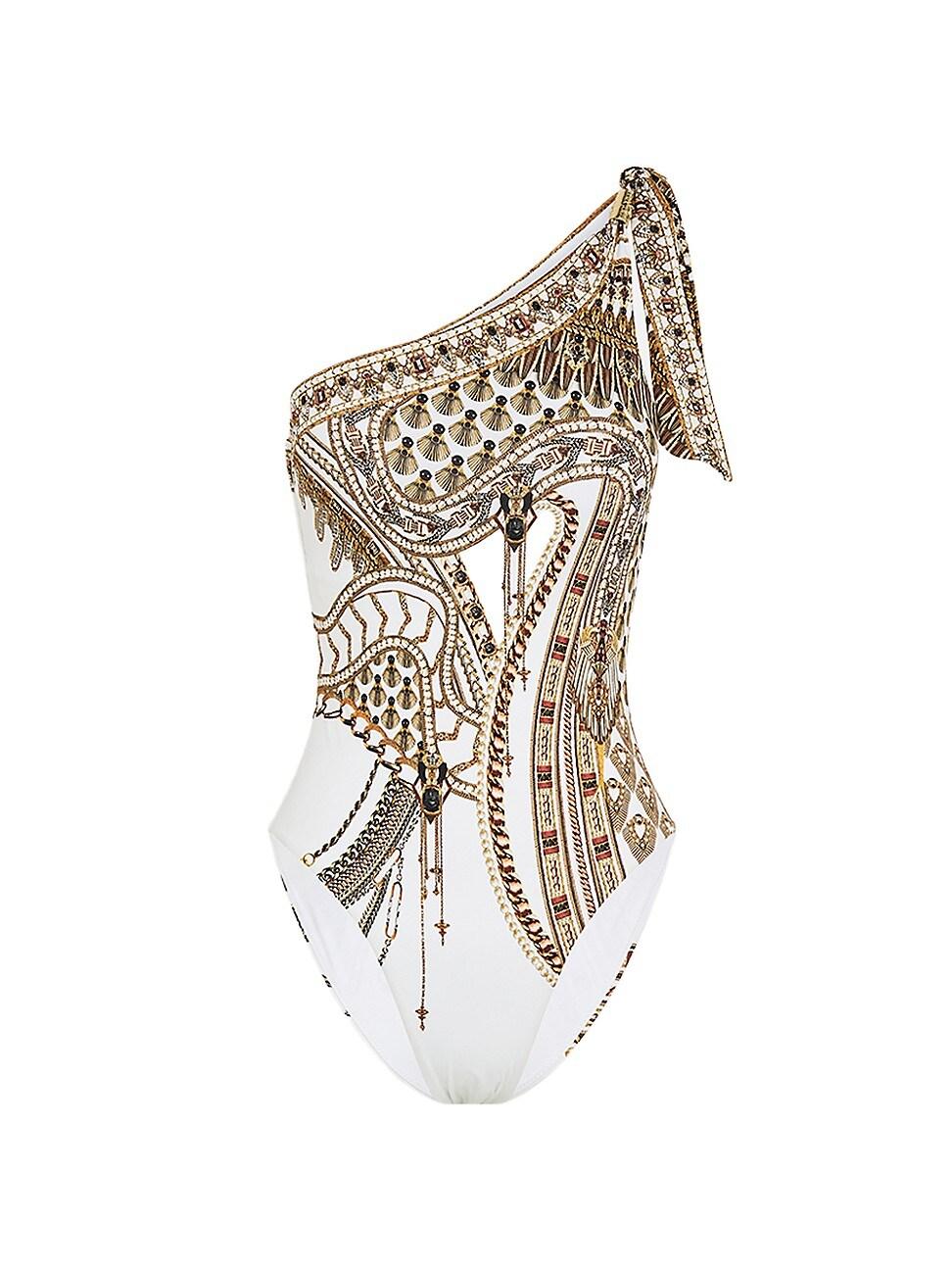 This Camilla swimsuit is decorated in a chain and snake print. The one-piece is complete with an asymmetrical neckline and a tie at the left shoulder. Includes removable cups Asymmetrical neck Open back One-shoulder tie closure Pulls on 82% polyamide/18% elastane Hand wash Imported. Outerwear And Swimwear - Contemporary Swim > Camilla > Saks Fifth Avenue > Barneys. Camilla. Color: Goddess Energy. Size: Small.