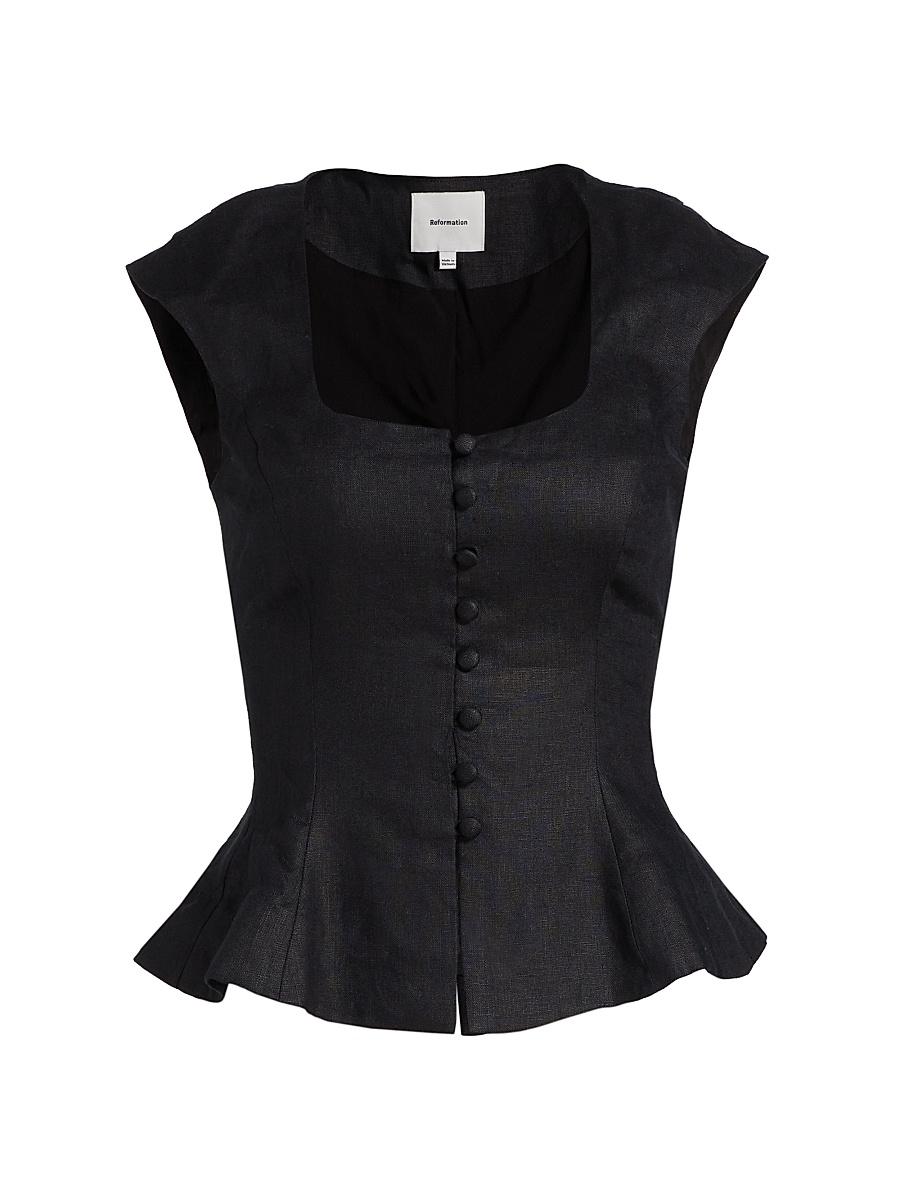 The Paolina top from Reformation is crafted of linen in a peplum silhouette, accentuated by a pleated flounce hem. Linen was made with processes meeting rigorous chemical input standards during parts of the textile formation process that are less impactful on the environment and people Squareneck Cap sleeves Back self-tie belt Button-front closure 100% linen Machine wash Imported SIZE & FIT About 22.25 from shoulder to hem Model measurements: 510 tall Model is wearing a US size Small. Contemp