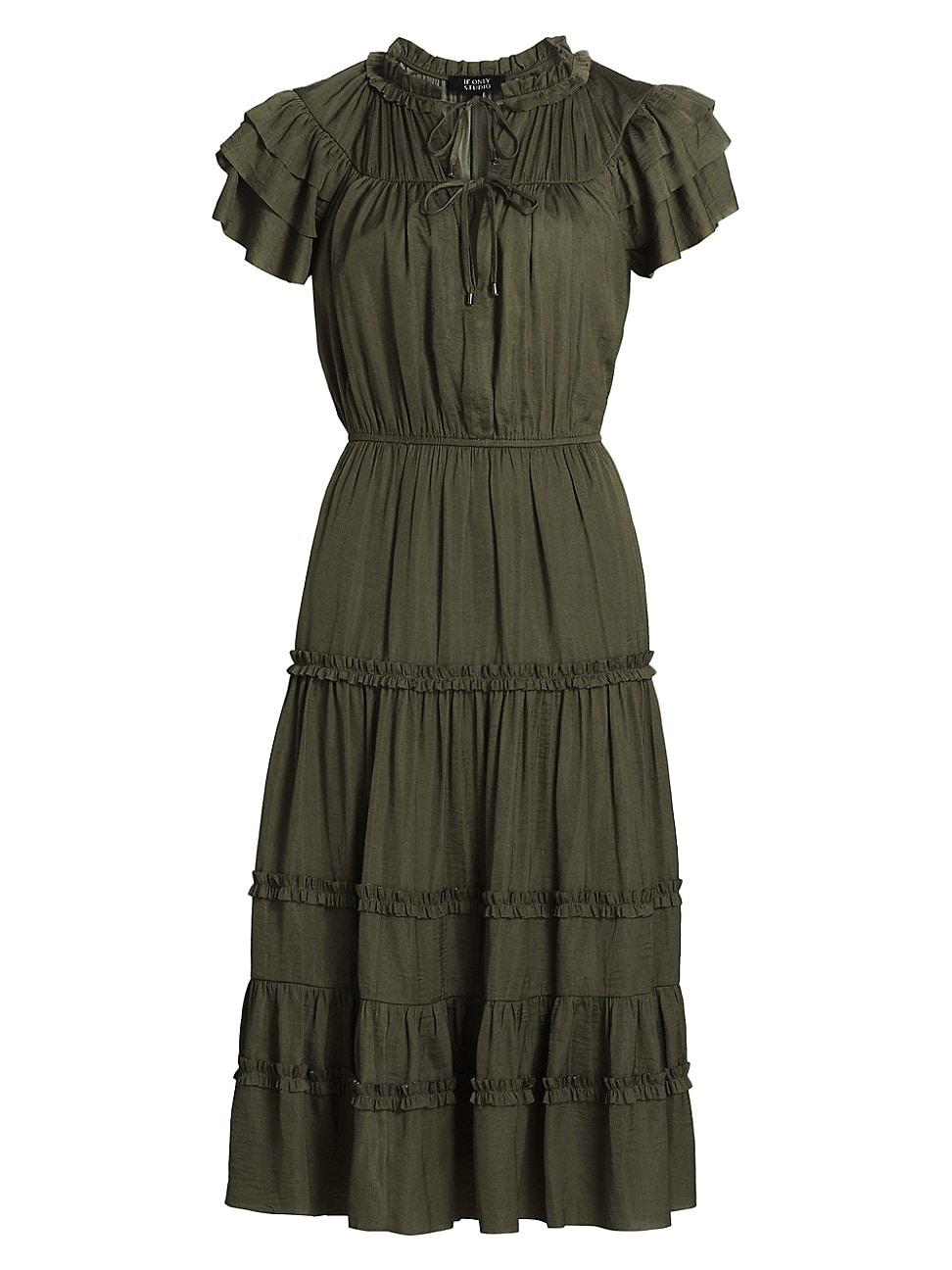 If Only Studios Parachute ruffled-trim midi-dress is desgiend with a pleated yoke, an elasticized waist, and a tiered skirt. Ruffled collar Splitneck with dual ties Layered flutter sleeves Pleated yoke Elasticized waistband Tiered skirt Pulls over 100% polyester Lining: 100% polyester Dry clean Imported SIZE & FIT About 43.5 from shoulder to hem Model measurements: 510 tall Model is wearing a US size Small. Contemporary Sportswear - Private Label Contempora > If Only Studio > Saks Fifth Avenue > Barneys. If Only Studio. Color: Green. Size: Small.