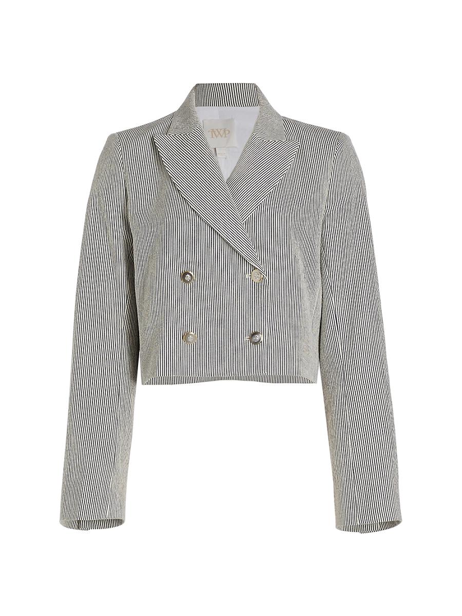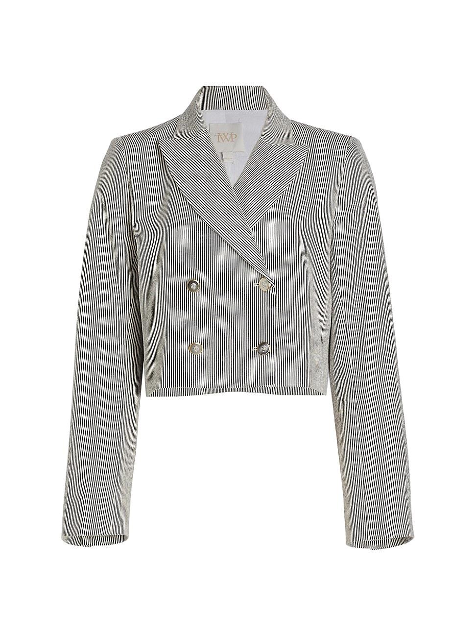 Crafted of striped wool, TWPs Perfect Waiter blazer flaunts peak lapels, a double-breasted button-front closure, and a cropped length. Peak lapels Long sleeves Double-breasted button-front closure Wool Lining: Silk Dry clean Made in USA of Italian fabric SIZE & FIT About 19.75 from shoulder to hem Model measurements: 510 tall Model is wearing a US size Small ABOUT THE BRAND New York-based label TWP offers modern, effortless takes on go-to wardrobe staples. On a mission to democratize luxury, founder Trish Westcoat Pound, of Haute Hippie fame, focuses on high-quality details and subtle-yet-alluring silhouettes to create elevated, everyday pieces-all made in the U.S. with fabrics sourced from Italy. Contemporary Sportswear - Contemporary Lifestyle > Twp > Saks Fifth Avenue > Barneys. TWP. Color: Navy Stripe. Size: Medium.
