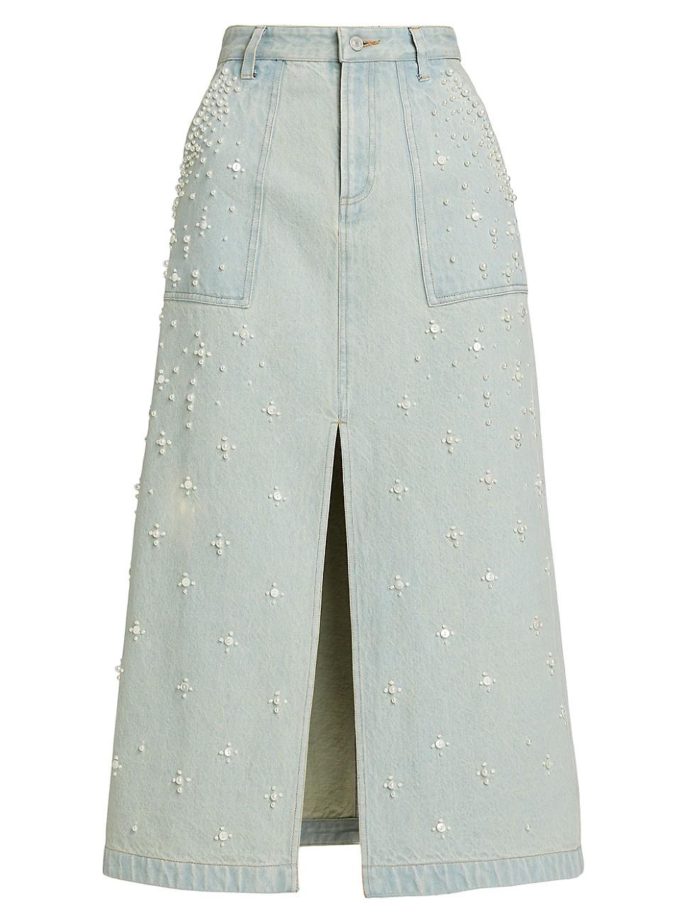 Crafted of washed denim, Seas Perlette midi-skirt is styled with belt loops, side pockets, and zip fly with button closure. Belt loops Side pockets Front slit Back patch pockets Zip fly, button closure 100% cotton Machine wash Imported SIZE & FIT Rise: about: 33 Model measurements: 510 tall Model is wearing a US size 4. Contemporary Sportswear - Workshop > Sea > Saks Fifth Avenue > Barneys. Sea. Color: Blue. Size: 16.
