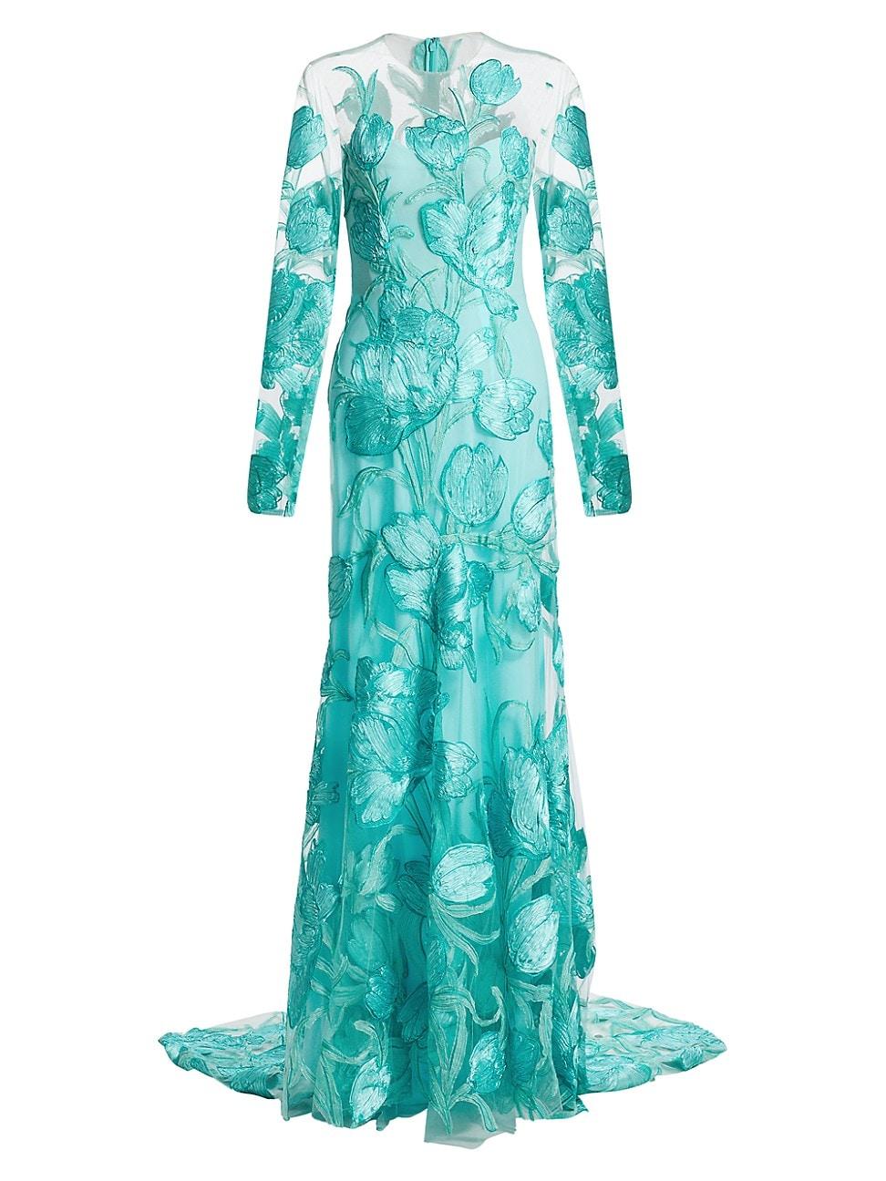 Finished in whimsical petal appliqus, Monique Lhuilliers trumpet gown showcases a mesh illusion bodice with long sleeves. Crewneck Mesh yoke Long sleeves Back zip closure 70% polyester/20% polyamide/10% viscose Lining: 100% silk Dry clean Made in USA of Italian fabric SIZE & FIT Model measurements: 510 tall Model is wearing a US size 4. Designer Evening - Classic Evening > Monique Lhuillier > Saks Fifth Avenue > Barneys. Monique Lhuillier. Color: Aqua. Size: 4.