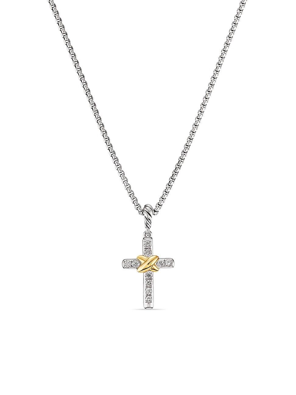 Womens Petite Cross Necklace in Sterling Silver with 18K Yellow Gold with Diamonds, 20.8mm