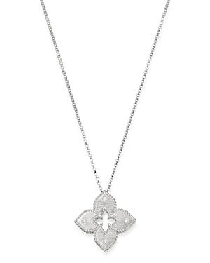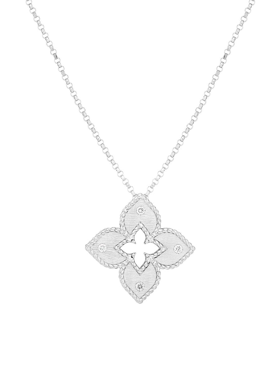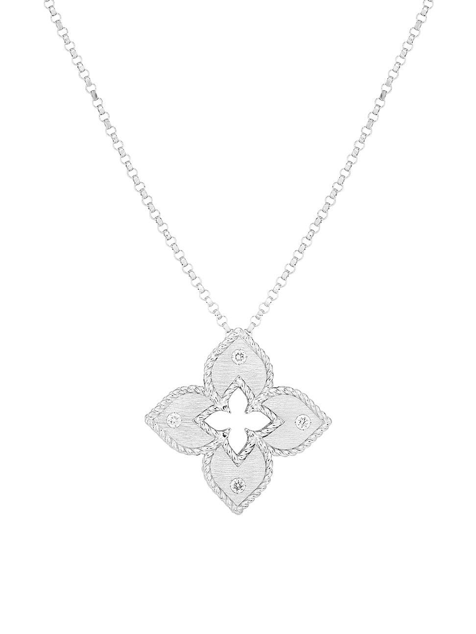 From the Venetian Princess Collection. Delicate chain necklace flaunts a Baroque-inspired brushed gold cutout flower pendant with diamond embellishment. Roberto Coin signs each piece with a single ruby placed in a hidden position. Diamonds, 0.06 tcw 18K white gold Lobster clasp Made in Italy SIZE Length, about 16-18 ABOUT THE BRAND Jewelry designer Roberto Coin founded his eponymous line in 1996, with a strong emphasis on elegance and creative experimentation. Each piece is the result of a long creative process, taking inspiration from cultural influences and nature. Fine Jewelry - Roberto Coin Asset > Roberto Coin > Saks Fifth Avenue > Barneys. Roberto Coin. Color: White Gold. Size: 16.