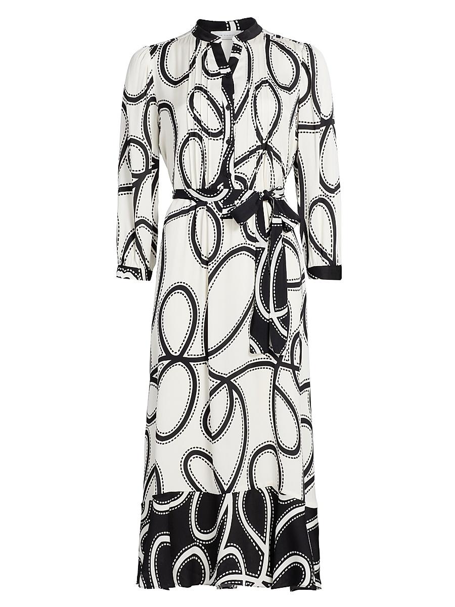 Crafted of a silk blend, Elie Taharis Phoenix midi-dress is styled with a dotted print, band collar, belted waist, and flounce hem. Band collar Bracelet-length sleeves Belted Partial button-front closure 52% silk/40% viscose/8% spandex Lining: 100% viscose Dry clean Imported SIZE & FIT Fit-and-flare silhouette About 50.5 from shoulder to hem Model measurements: 510 tall Model is wearing a US size Small. Modern Collections - Elie Tahari > Elie Tahari > Saks Fifth Avenue. Elie Tahari. Color: D