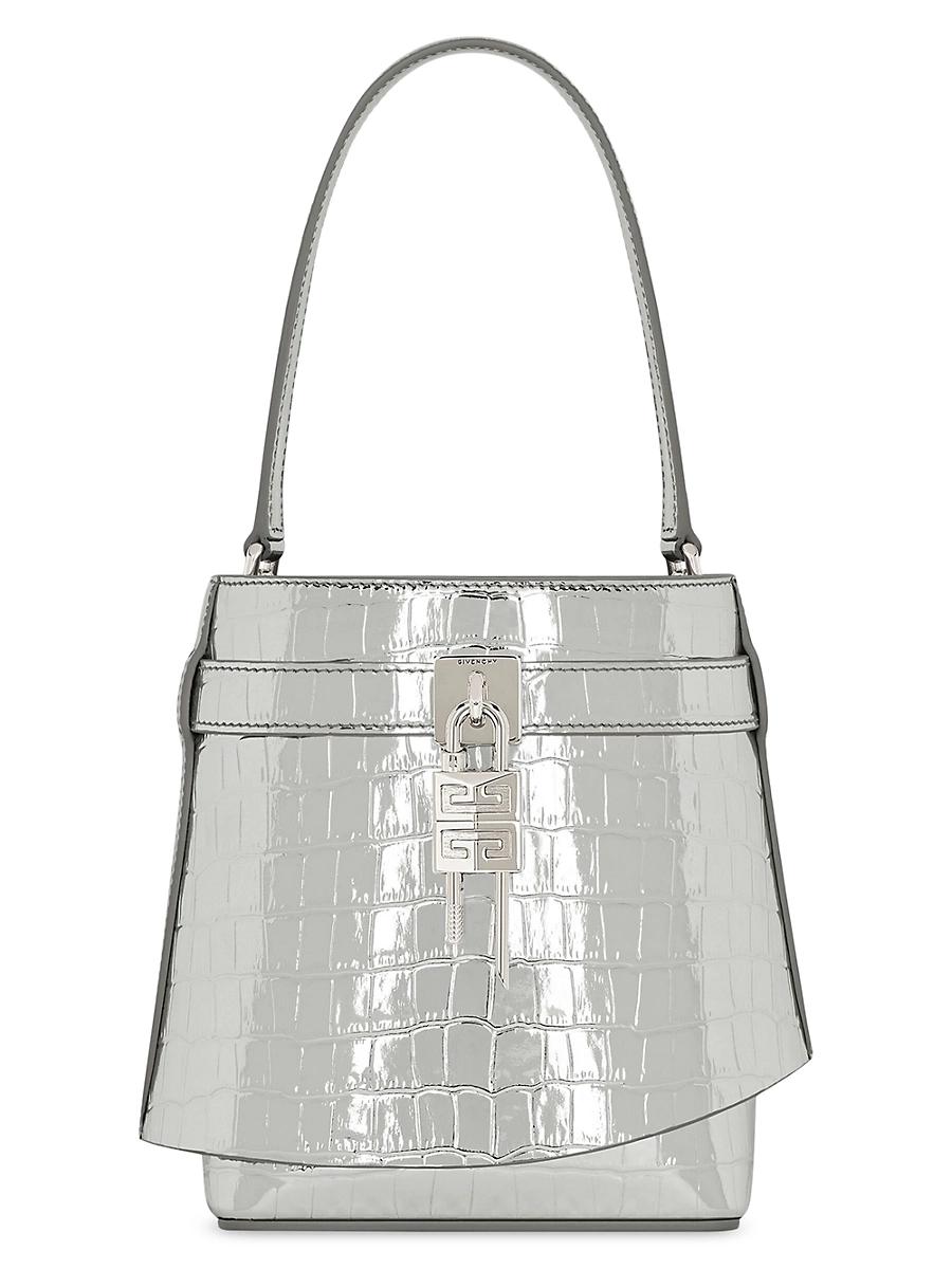 Shark Lock bucket bag in crocodile effect leather. Bucket bag in crocodile-effect embossed metallic leather, to be carried by hand Shark Lock line Leather handles for comfortable hand carry Thin adjustable and removable leather strap offering shoulder or crossbody carrying Leather band featuring Givenchy metal clasp and 4G padlock Silvery-finish metal details One main compartment Canvas lining 7.87 in. x 7.48 in. x 5.71 in. Composition: 100% calfskin Secondary material: 100% sheep leather Made in Italy. Lsd Handbags - Givenchy > Givenchy > Saks Fifth Avenue > Barneys. Givenchy. Color: Light Silvery.