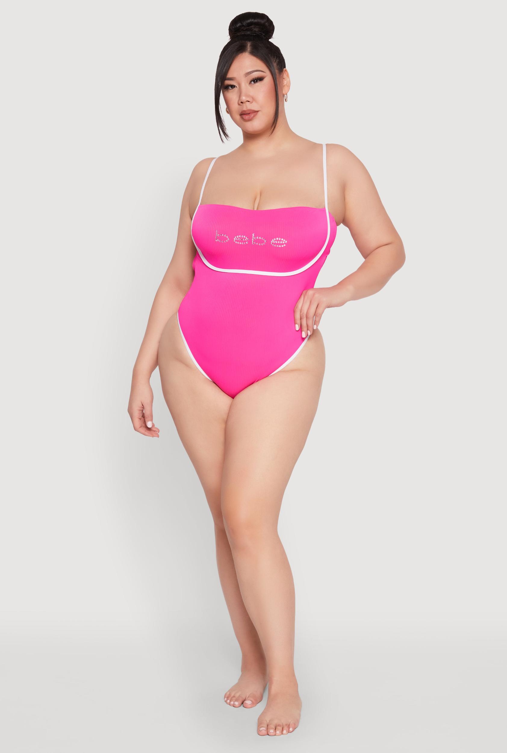 Womens Plus Size Bebe Rhinestone Tie Back One Piece Swimsuit