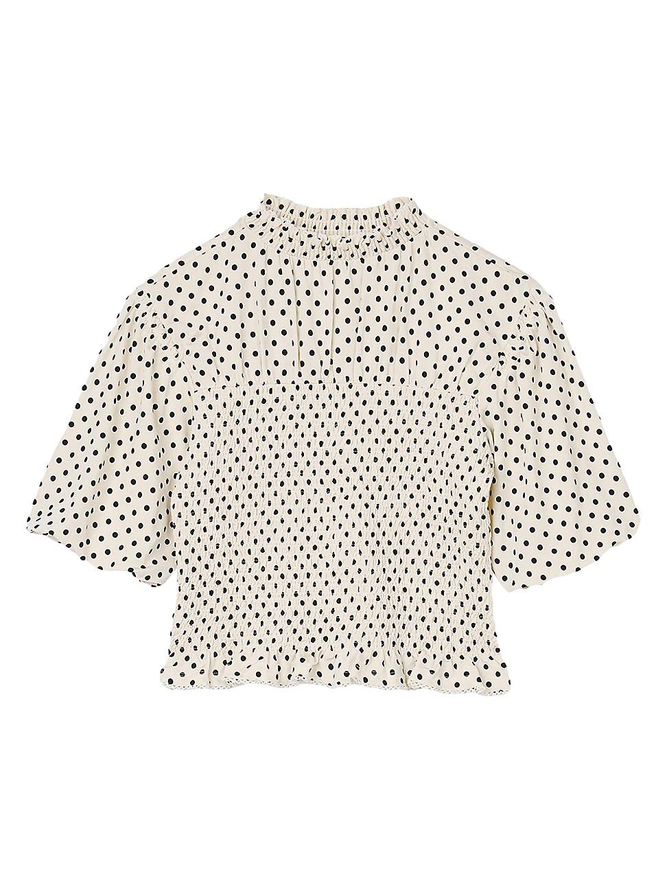 Smocked t-shirt with contrasting polka dots, ruffled high neck and balloon sleeves. Sandro Womens smocked t-shirt Polka dot pattern High neck and ruffled hem Balloon sleeves Main fabric: 95% viscose, 5% elastane Embroidery: 72% polyester, 28% viscose Imported SIZE & FIT Model measurements: 511 Model is wearing a size 1. Lsd Rtw - Sandro > Sandro > Saks Fifth Avenue > Barneys. Sandro. Color: Ecru Black. Size: XS.