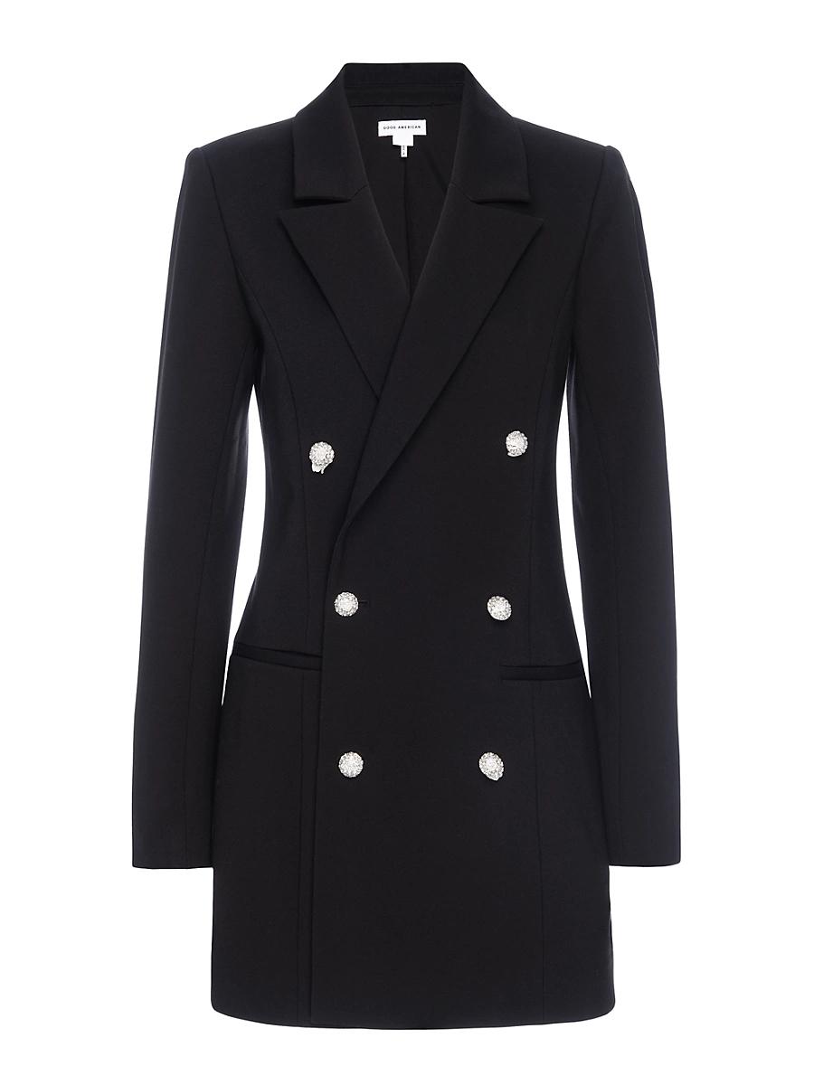 GOOD AMERICANs Executive ponte blazer minidress flaunts a sleek tailored silhouette and classic notch lapels. Double-breasted embellished button closures complete this mini-length look. Notch lapels Shoulder pads Long sleeves, buttoned cuffs Front welt pockets Double-breasted button closure 68% rayon/27% nylon/5% spandex Hand wash Imported S IZE & FIT About 33 from shoulder to hem Model measurements: 510 tall Model is wearing a US size 4 ABOUT THE BRAND GOOD AMERICAN Cofounders Khlo Kardashian and Emma Grede launched the denim and ready-to-wear label in 2016 with the goal of bringing body positivity to mainstream fashion. From figure-hugging bodysuits to faux leather pants, the all-inclusive line brings an edge and fresh perspective to everyday essentials. Contemporary Sportswear - Denim And Bottoms > Good American > Saks Fifth Avenue > Barneys. Good American. Color: Black. Size: Large.