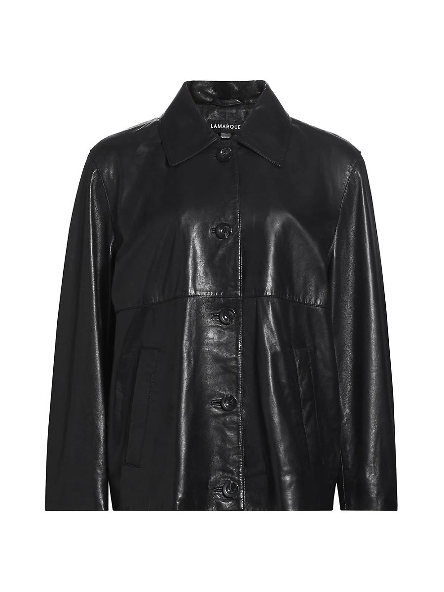 Crafted of smooth leather, Lamarques Presley shirt jacket offers an elevated, relaxed fit. The garment features a pointed collar, side welt pockets, and a button-front closure. Point collar Long sleeves Side welt pockets Button-front closure 100% leather Lining: 100% polyester Dry clean by leather specialist Imported SIZE & FIT This style is designed for a relaxed fit About 27.5 from shoulder to hem Model measurements: 510 tall Model is wearing a US size Small. Contemporary Sportswear - Trend > Lamarque > Saks Fifth Avenue > Barneys. Lamarque. Color: Black. Size: Medium.