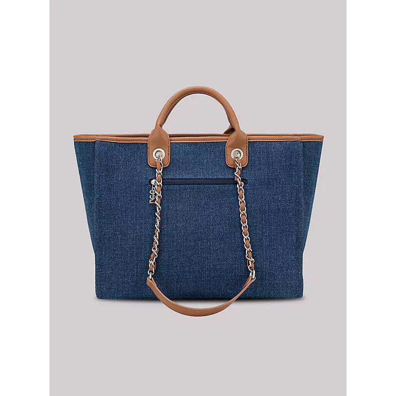 "Take your love of denim to the next level. This unique purse is modeled after our iconic denim, even carrying the leather label on the side. With a vintage-inspired chain strap and our signature logo on the side, this tote ties together any look. Size Dimensions: 18"" x 5"" x 12"" Top zipper closure Inside single compartment divided by a medium zippered pocket A zippered pocket on the back Metal feet on the bottom for protection and stability Double round handle Double chain flat strap" 100% Polyurethane. Dark Denim. ONE SIZE.