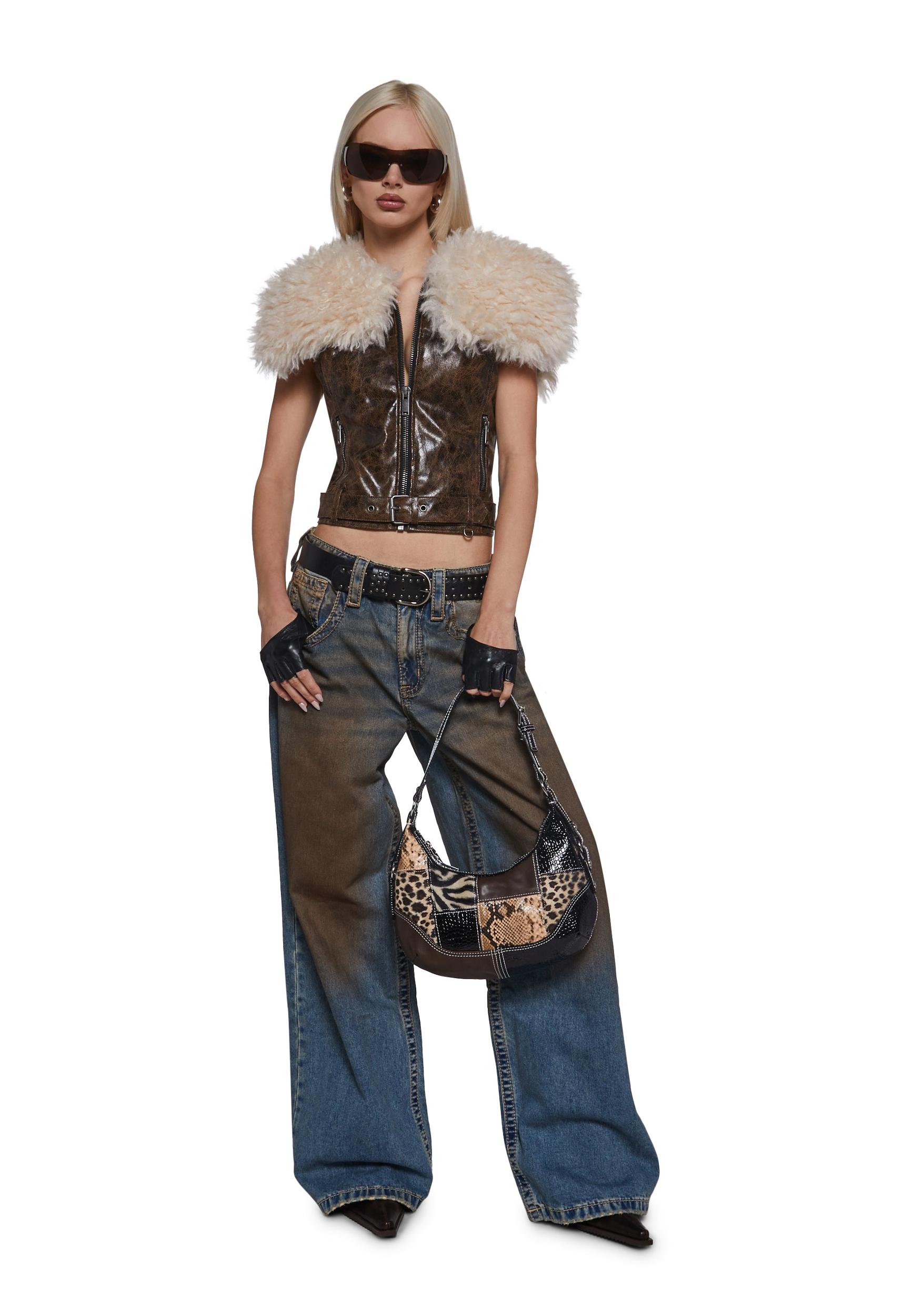 Womens PU Moto Vest With Faux Fur - Brown