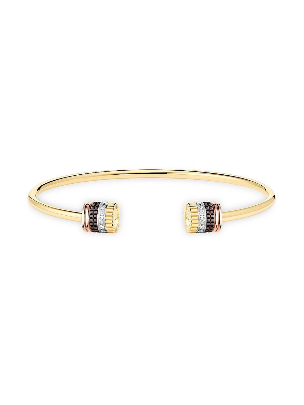 From the Quatre Classique Collection. Crafted of tri-tone 18K gold accented with brown PVD plating, Boucherons cuff is tipped with four bands, each showcasing one of the Parisian labels iconic design elements. Pav diamonds lend radiant shimmer to this graphic piece. Diamonds, 0.23 tcw 18K yellow, rose, and white gold with brown PVD plating Slips on Made in Switzerland SIZE About 2.5 diameter ABOUT THE BRAND Parisian jewelry designer Frdric Boucheron got his start when he opened a Place Vendme jewelry boutique in 1858, specializing in high jewelry and watchmaking, and soon came to be known as a visionary in his realm. Generations later, the global label has maintained its reputation for prestige through the bold and innovative character of its pieces. Fine Jewelry - Fine Jewelry > Boucheron > Saks Fifth Avenue > Barneys. Boucheron. Color: Yellow Gold.