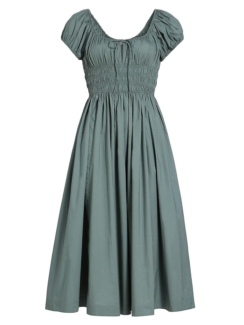 Crafted of cotton, DENs Quinn midi-dress is styled with a scoopneck, short balloon sleeves, and a smocked bodice. Scoopneck, scooped back Short balloon sleeves, elasticized cuffs Front self-tie closure 100% cotton Hand wash Imported SIZE & FIT About 49.5 from shoulder to hem Model measurements: 510 tall Model is wearing a US size 4. Contemporary Sportswear - Workshop > Den > Saks Fifth Avenue > Barneys. DEN. Color: Lagoon. Size: Small.