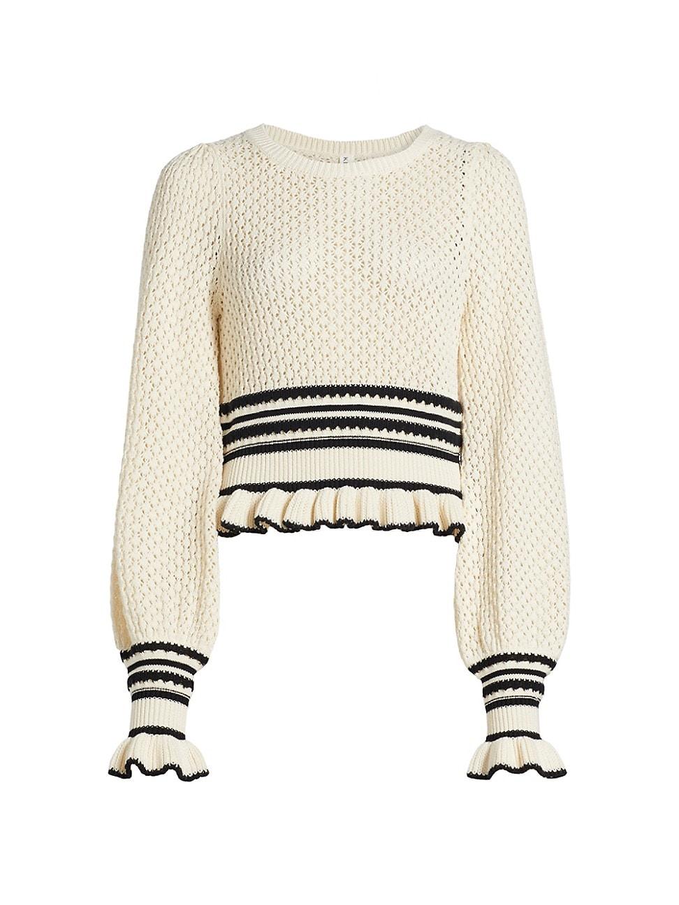 Crafted of pure cotton, the Rafaela crop top by Kivari highlights delicate pointelle-knit detailing and contrast stripes. Ruffled trim and long blouson sleeves complete the pull-over style. Crewneck Long sleeves, ruffled cuffs Pulls over 100% cotton Hand wash Imported SIZE & FIT About 17 from shoulder to hem Model measurements: 510 tall Model is wearing a US size Small. Contemporary Sportswear - Trend > Kivari > Saks Fifth Avenue > Barneys. Kivari. Color: Stripe. Size: Small.
