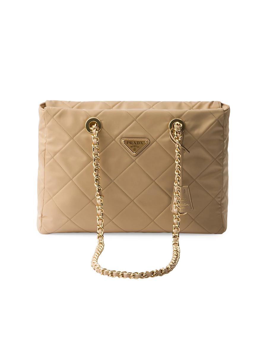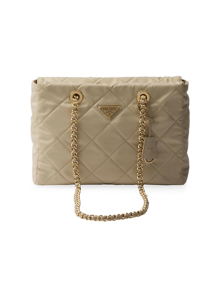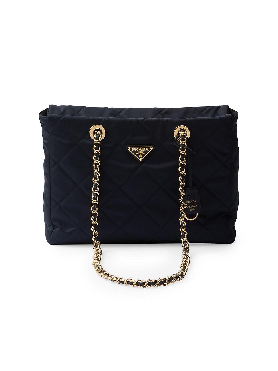 This tote bag with timeless charm, a re-edition of an archive design, summarizes Prada codes in a sophisticated and pragmatic silhouette. The style with soft volumes is made of re-nylon, an innovative fabric made of regenerated nylon, the sustainable evolution of a distinctive material of the brand. Elegant leather-threaded metal chain handles complete the accessory with vintage charm, embellished with the iconic enameled metal triangle logo. Lightly padded and quilted Leather-threaded chain handles Removable re-edition leather key ring Metal hardware Enameled metal triangle logo on the front Zipper closure Logo-print Re-nylon lining with zipper pocket Made in Italy SIZE 12.2 W x 8.6 H x 3.3 L. Lsd Handbags - Prada Handbags Access > Prada > Saks Fifth Avenue > Barneys. Prada. Color: Blue.