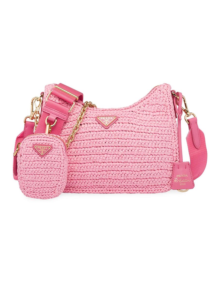 Inspired by the iconic nylon mini hobo bag, the Prada Re-Edition shoulder bag is made of raffia, a material of natural origin imbued with a summery mood. Thanks to its removable components, the accessory has a versatile spirit and can be combined and personalized in different ways. Smooth leather details Detachable chain handle Detachable adjustable 85 cm logo-print woven tape shoulder strap Removable raffia zipper pouch and Re-Edition keychain Metal hardware Enameled metal triangle logo on the front Zipper closure Re-Nylon logo-print lining Imported This product is not eligible for extended holiday returns SIZE 22.0 / 8.6W x 18.0 / 7H x 6.0 / 2.3L. Lsd Handbags - Prada Handbags Access > Prada > Saks Fifth Avenue > Barneys. Prada. Color: Pink.