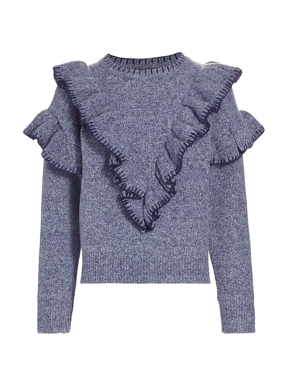 En Saisons Rene pullover sweater is decorated with chic ruffle details along the front and sleeves. Round neck Long sleeves Pullover style Ribbed trim 100% polyester Hand wash Imported SIZE & FIT About 23.5 from shoulder to hem Model measurements: 510 tall Model is wearing a US size Small. Contemporary Sportswear - Trend > En Saison > Saks Fifth Avenue > Barneys. En Saison. Color: Navy. Size: XS.
