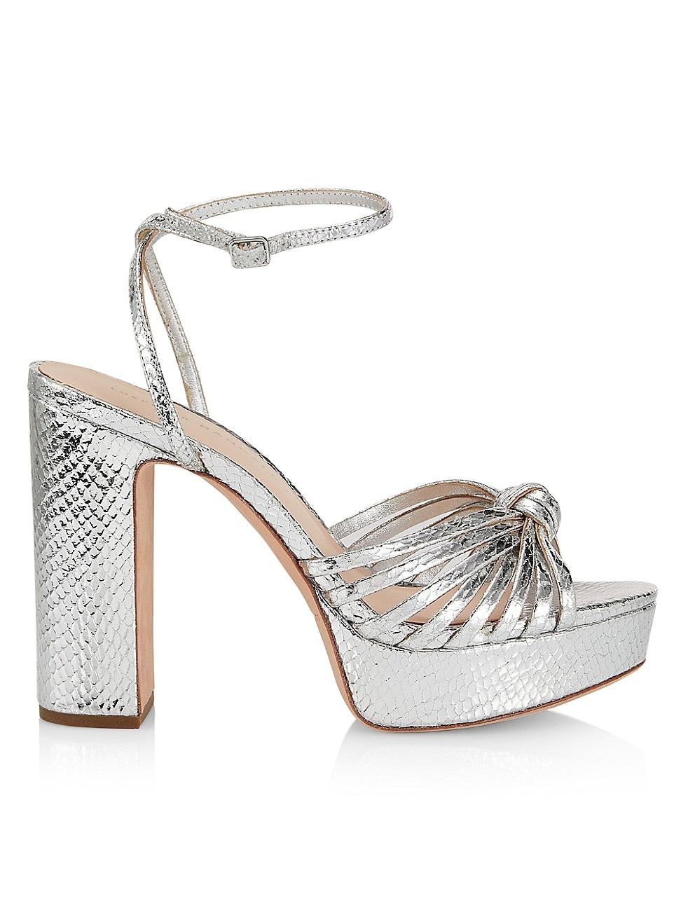 Loeffler Randalls Rivka sandals are crafted of metallic snake-embossed leather with a knotted upper. Leather upper Peep toe Adjustable buckle closure Leather sole Imported SIZE Block heel, about 4.5 (115mm) Platform, about 1.25. Womens Shoes - Contemporary Shoes > Loeffler Randall > Saks Fifth Avenue > Barneys. Loeffler Randall. Color: Silver. Size: 12.