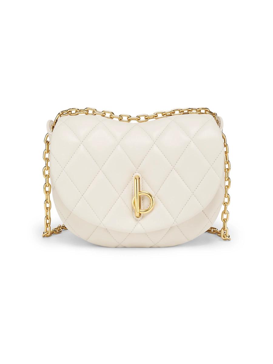 Crafted of quilted leather, this Rocking Horse shoulder bag from Burberry bag features a chain strap and flap with signature b closure. Chain strap Flap with b closure Leather Made in Italy SIZE About 9.5W x 8.3H x 3.4D Chain strap: about 20.5 drop ABOUT THE BRAND Founded in 1856 by 21-year-old Thomas Burberry, the brand set out with a mission to stylishly protect against British weather-and Burberrys iconic trench coat was born. In the 1920s, its renowned check pattern was introduced as the coats lining. Today, under Creative Director Daniel Lee, the heritage brand continues to evolve and create timelessly classic mens, womens and kids pieces, along with beauty. Handbags - Burberry Handbags > Burberry > Saks Fifth Avenue > Barneys. Burberry. Color: Soap.