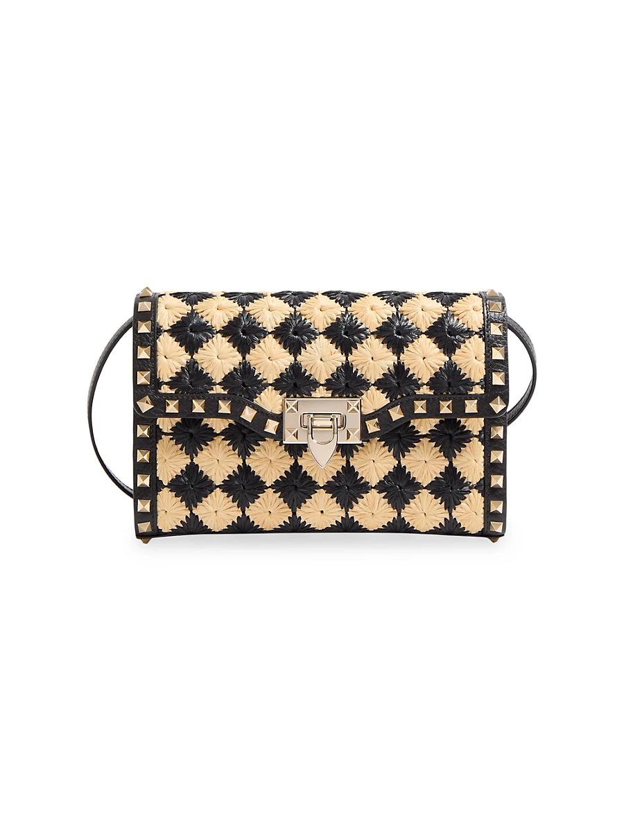 Valentino Garavani Rockstud small shoulder bag with synthetic raffia check pattern embroidery and leather details. Platinum finish studs and hardware Hook closure Adjustable shoulder strap Canvas lining. Interior: open slip pocket Shoulder strap drop length: 54 cm / 21.3 in. Dimensions: W23 x H15 x D7 cm / W9.1 x H5.9 x D2.7 in. Made in Italy. Lsd Handbags - Valentino Handbags > Valentino Garavani > Saks Fifth Avenue > Barneys. Valentino Garavani. Color: Natural Black.