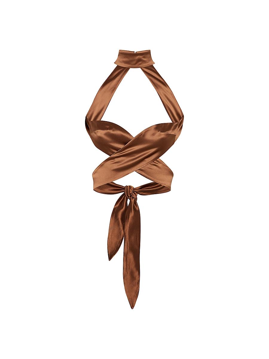 retrofete Ross Top in Metallic Bronze. - size L (also in S) retrofete Ross Top in Metallic Bronze. - size L (also in S) 76% acetate 24% polyester. Made in China. Dry clean only. Collar with loop button closure and back tie closure. Padded bust. Satin fabric. ROFR-WS153. FW22-5490. Retrofete, launched in 2018 by co-founders Ohad Seroya and Aviad Klin, embodies the glamour and opulence of decades past. Having gained notoriety for its sequin-clad party frocks, the New York-based label has evolved into a collection of daring, top-to-toe designs that seamlessly transform from day to night. Regardless of where she goes, you can count on the Retrofete girl to bring the party.