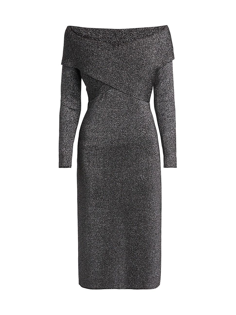 Elie Taharis sleek Rowan midi-length sweaterdress showcases a shimmering metallic thread and flattering crossbody bodice. Cut with an off-the-shoulder neckline, this body-con silhouette flaunts fitted long sleeves. Off-the-shoulder neck Long sleeves Wrapped bodice Pulls over 49% viscose/23% nylon/23% polyester/5% metallic polyester Hand wash Imported SIZE & FIT About 45.5 from shoulder to hem Model measurements: 510 tall Model is wearing a US size Small. Modern Collections - Elie Tahari > Elie Tahari > Saks Fifth Avenue > Barneys. Elie Tahari. Color: Noir With Gunmetal Lurex. Size: Large.