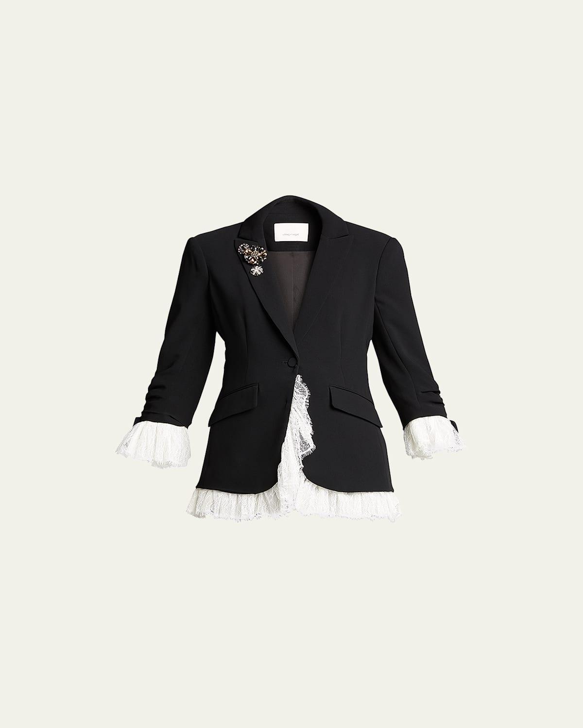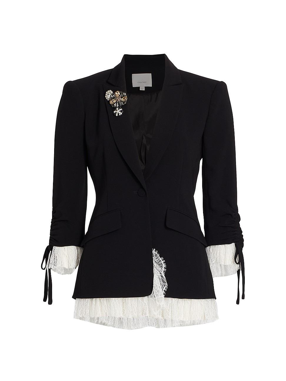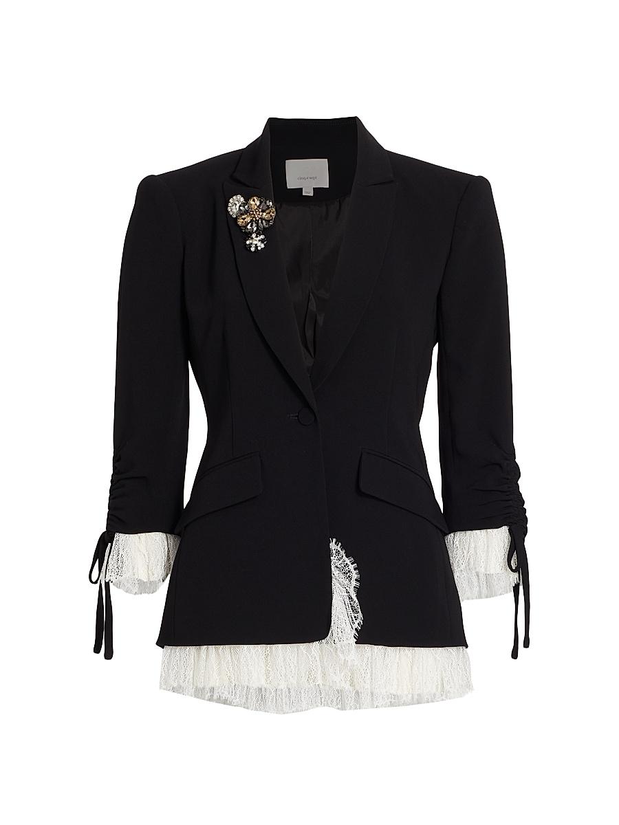 This crepe blazer is styled with contrast lace trim. Peak lapels Drawstring three-quarter-length sleeves One-button closure Flap side pockets 69% triacetate/31% polyester Dry clean only Imported SIZE & FIT About 30 from shoulder to hem Model measurements: 510 tall Model is wearing a US size 4 ABOUT THE BRAND Inspired by the radiant, magical hours between 5 and 7 PM-which is what the labels French name translates to-founder Jane Siskin designs sophisticated, feminine pieces for both workweek and the weekend. The designers silhouettes also play with volume and eye-catching trimmings-perfect for cocktails or a special night out. Contemporary Sportswear - Cinq A Sept > Cinq Sept > Saks Fifth Avenue > Barneys. Cinq Sept. Color: Black Ivory. Size: 00.