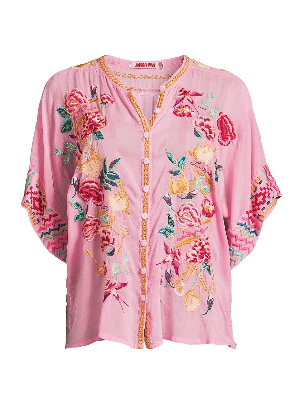 Made of lightweight cotton, this button-front Roylane blouse from Johnny Was features vibrant embroidery, a band collar, and short flutter sleeves. Band collar Flutter sleeves Button-front closure 100% rayon Hand wash Imported SIZE & FIT About 26 from shoulder to hem Model measurements: 510 tall Model is wearing a US size Small ABOUT THE BRAND Embracing the ease of a West Coast lifestyle, Johnny Was takes a bohemian mindset to a new level in romantic flowing dresses and tops. The brands signatures include floral prints, embroidery, artisan-inspired stitches and embellishments like beading and tassels. Modern Collections - Johnny Was > Johnny Was > Saks Fifth Avenue > Barneys. Johnny Was. Color: Spring Rose. Size: XS.
