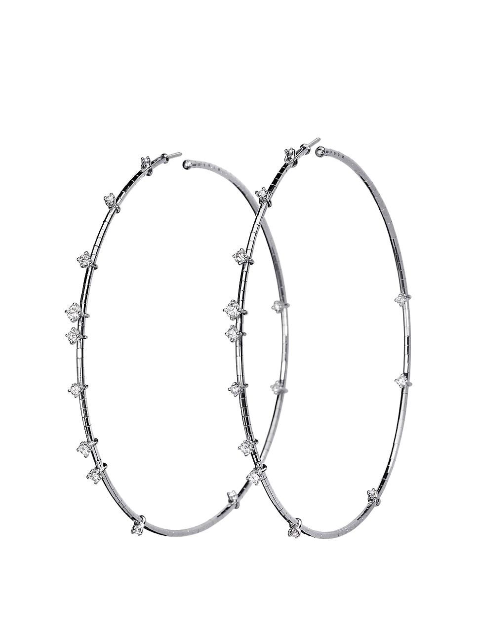 From the Rugiada Diamanti Collection. Mattia Cielos flexible hoop earrings are made of 18K white gold and titanium embellished with scattered round brilliant-cut diamonds. Founded in 2006, the eponymous jewelry label combines cutting-edge technology with ancient goldsmithing techniques to craft its innovative, lightweight pieces. Diamonds, 1.10 tcw Diamond color grade: G Diamond clarity grade: VS 18K white gold/titanium Post back Made in Italy SIZE About 3 diameter Please note: Model shot is provided for scale and styling purposes only. The true metal color of the product is accurately reflected in the feature image. Fine Jewelry - Fine Designer Jewelry > Mattia Cielo > Saks Fifth Avenue > Barneys. Mattia Cielo. Color: White Gold.