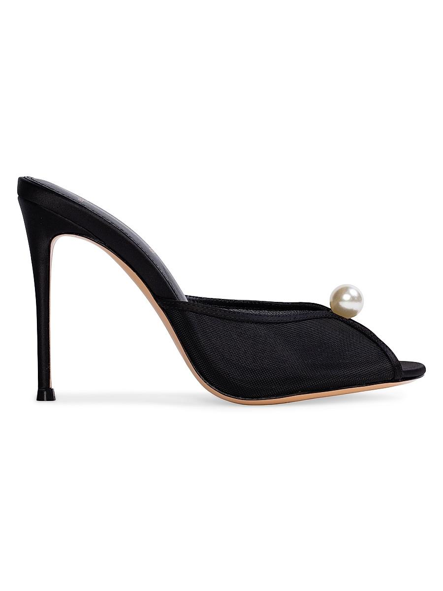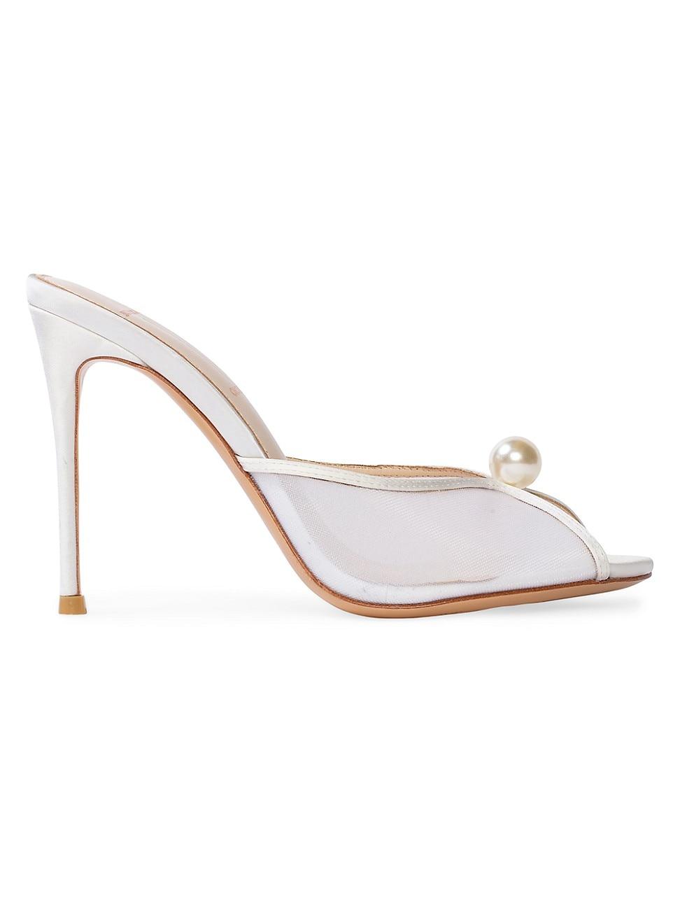 Round toe slipper mules with mesh and pearl ornament detailing, set on a straight stiletto heels. Made with satin crepe Heel Height: 100mm / 4 Imported. Lsd Shoes - Shoes Lsd Mp > Black Suede Studio > Saks Fifth Avenue > Barneys. Black Suede Studio. Color: White Satin. Size: 11.