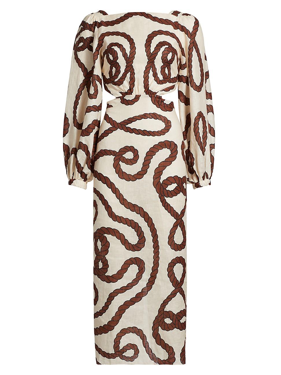 From the Fermina Resort Collection. Finished in a robe print, Johanna Ortizs Sailing Robes maxi dress showcases a light linen design. This piece features a square neck, long blouson sleeves, and an open back. Square neck Long sleeves Back self-tie closure Back zip closure 100% linen Lining: 100% cotton Dry clean Imported SIZE & FIT About 53.25 from shoulder to hem Model measurements: 510 tall Model is wearing a US size 4. Designer Lifestyle - Johanna Ortiz > Johanna Ortiz > Saks Fifth Avenue > Barneys. Johanna Ortiz. Color: Ecru Paprika. Size: 8.