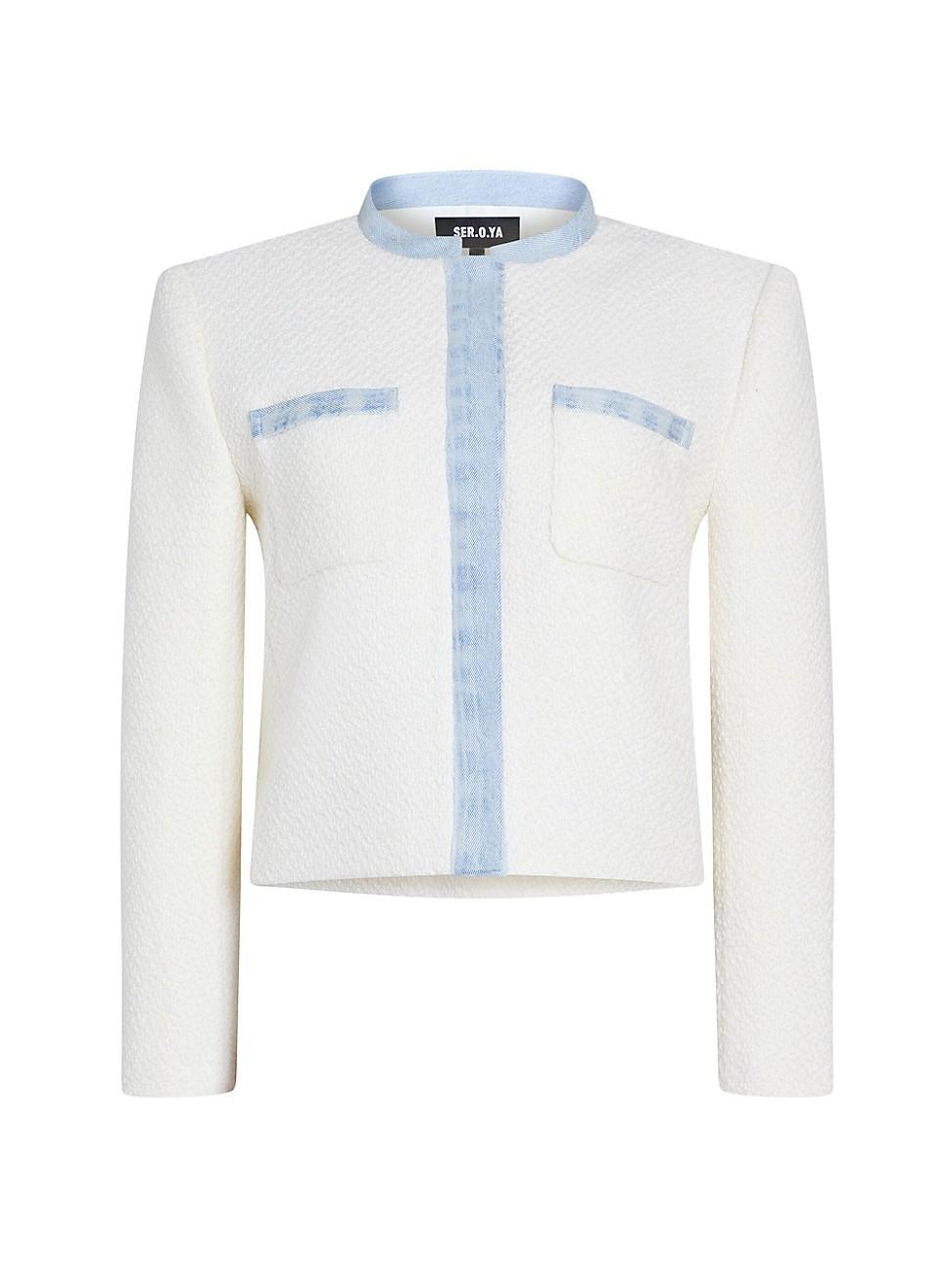 Boucle lady jacket with denim piping details and hidden clasp closures. Pair with our Harper Mini Skort for a matching set look. 79% Polyester, 21% Wool Model is 510 wearing size S Imported. Lsd Rtw - Womens Rtw Lsd Mp > Ser.o.ya > Saks Fifth Avenue > Barneys. Ser.o.ya. Color: Eggshell. Size: XXL.