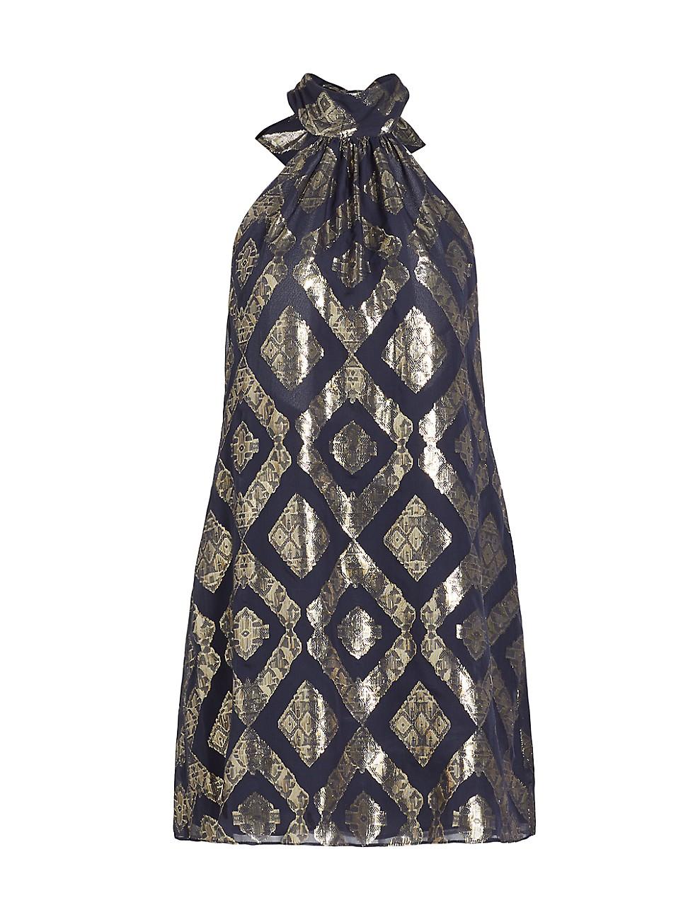 Finished in a metallic geometric print, Ramy Brooks Sam minidress showcases a dynamic halterneck and sleeveless design. Halterneck Sleeveless Back self-tie closure 70% silk/30% metallic fiber Dry clean Imported SIZE & FIT About 33 from topline to hem Model measurements: 510 tall Model is wearing a US size 4. Dress Collections - Contemporary Evening > Ramy Brook > Saks Fifth Avenue > Barneys. Ramy Brook. Color: Navy Metallic Geo Jacquard. Size: 00.