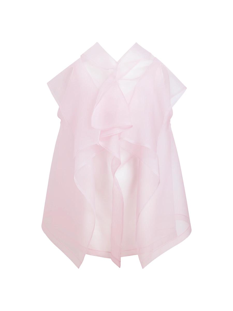 This Santana top from Khaite is crafted of layers of silk organza and designed with cascading ruffles and a handkerchief hem. V-neck Cap sleeves Handkerchief hem Pulls over 100% silk Dry clean Made in Italy SIZE & FIT About 29 from shoulder to hem Model measurements: 510 tall Model is wearing a US size Small. Designer Lifestyle - Khaite > Khaite > Saks Fifth Avenue > Barneys. Khaite. Color: Peony. Size: Small.