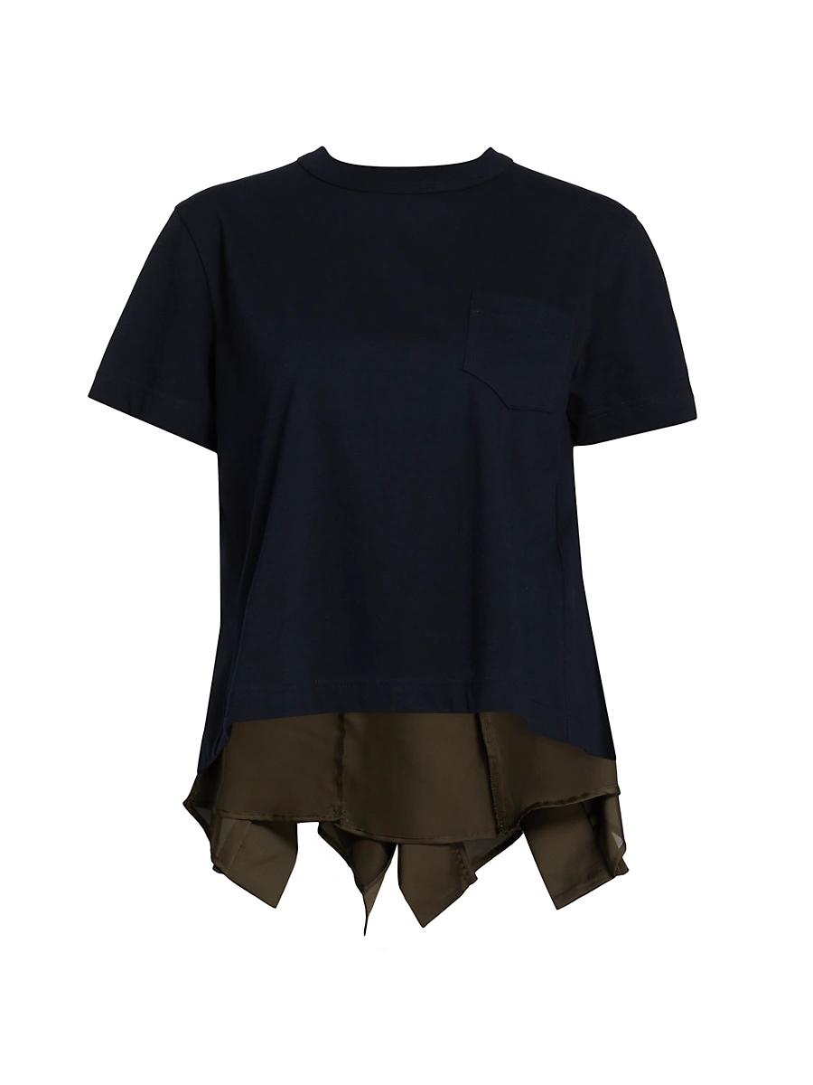 Sacais jersey cotton crewneck T-shirt takes a deconstructed twist, upgraded with a waterfall-hem satin panel at the back. Crewneck Short sleeves Pulls over 100% cotton Combo: 100% polyester Dry clean Made in Japan SIZE & FIT This style is designed for a relaxed fit About 23 from shoulder to hem Model measurements: 510 tall Model is wearing a US size Small. Advanced Designer - Sacai > Sacai > Saks Fifth Avenue > Barneys. Sacai. Color: Navy Khaki. Size: Small.