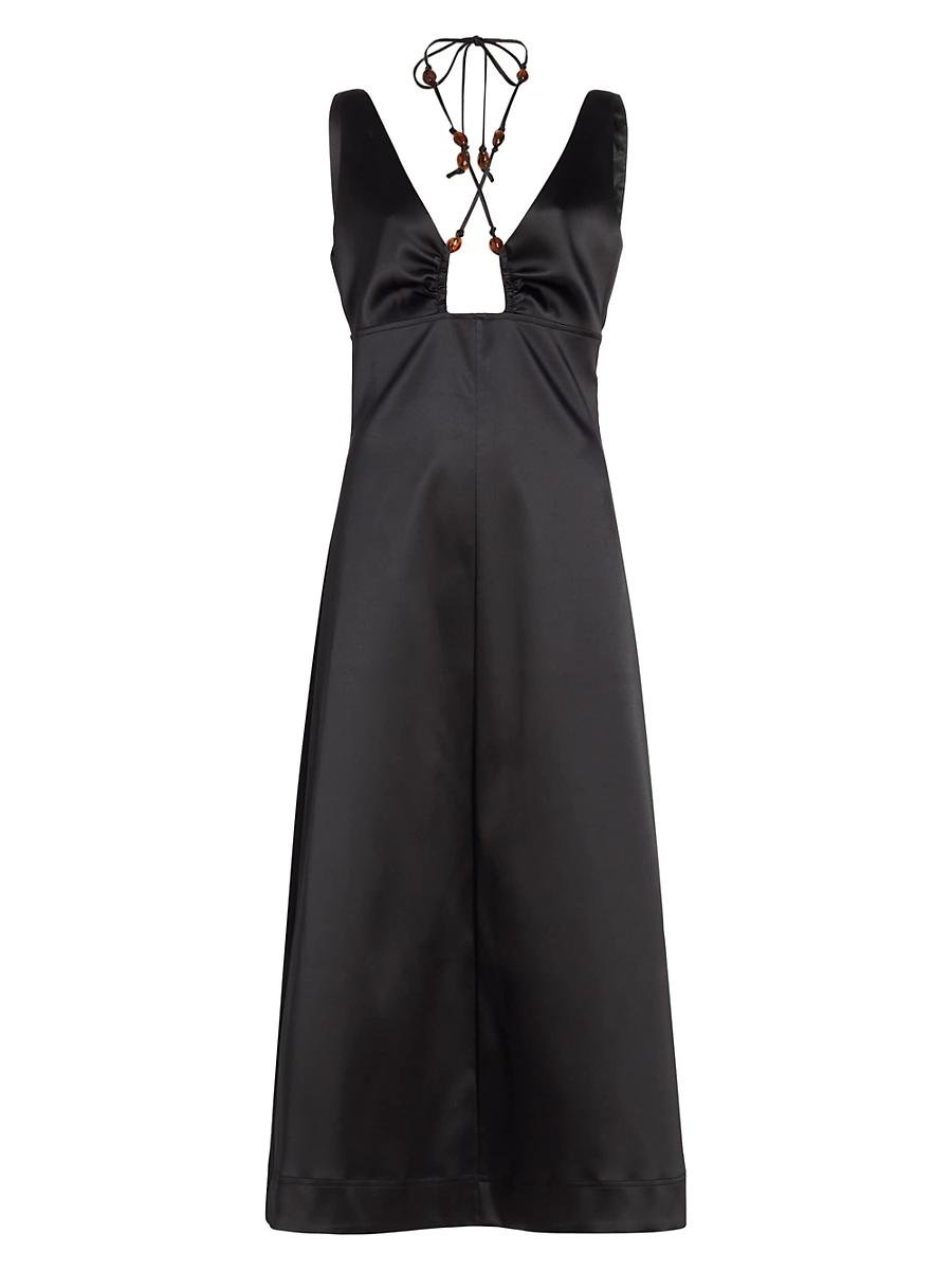 Crafted of satin, this GANNI midi-dress features beaded detailing at the neck, and a breezy open back. V-neck Tie-neck Open back Back slit Side-zip closure 91% polyester/9% elastane Machine wash Imported SIZE & FIT About 52 from shoulder to hem Model measurements: 510 tall Model is wearing a US size Small. Contemporary Sportswear - Contemporary Collections > Ganni > Saks Fifth Avenue > Barneys. Ganni. Color: Black. Size: 2.