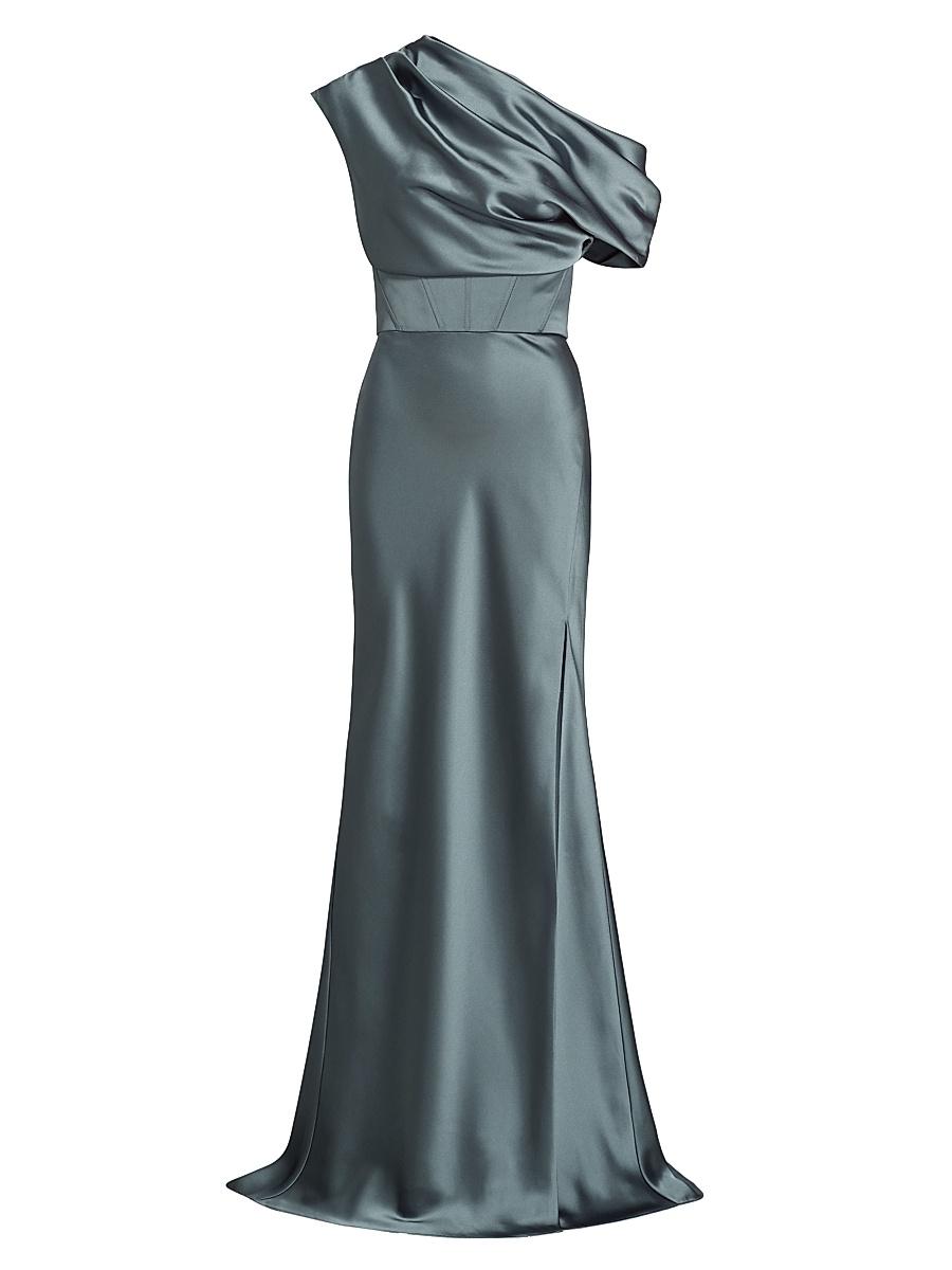 Crafted of satin, this one-shoulder floor-length gown by Amsale flaunts a draped asymmetrical neckline showcasing a boned bodice for a cinched silhouette. One-shoulder neck Sleeveless Side slit hem Back zipper closure 100% polyester Dry clean Imported SIZE & FIT About 61.5 from shoulder to hem Model measurements: 510 tall Model is wearing a US size 4 Please Note: This item runs small. Dress Collections - Modern Evening > Amsale > Saks Fifth Avenue > Barneys. Amsale. Color: Petrol. Size: 6.