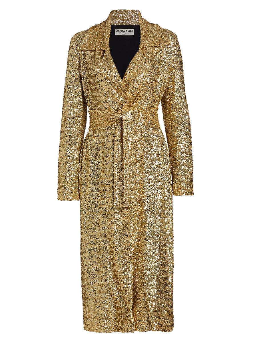 ONLY AT SAKS. Chiara Boni La Petite Robes Saveria long sequined coat features a wrap silhouette with a notch collar, long sleeves, and a belted waist. Notch collar Long sleeves Removable self-belt Fabric 1: 100% polyester Fabric 2: 72% polyamide/28% elastane Dry clean Made in Italy SIZE & FIT Fitted About 42 from shoulder to hem Model measurements: 510 tall Model is wearing a US size 4 ABOUT THE BRAND Self-taught designer Chiara Boni began her career creating ready-to-wear for several Italian labels before launching Chiara Boni La Petite Robe in 2007. With a focus on flattering the female form, her elegant and versatile styles have gained a loyal following. Dress Collections - La Petite Robe Di Chiara > Chiara Boni La Petite Robe > Saks Fifth Avenue > Barneys. Chiara Boni La Petite Robe. Color: Oro. Size: Large.