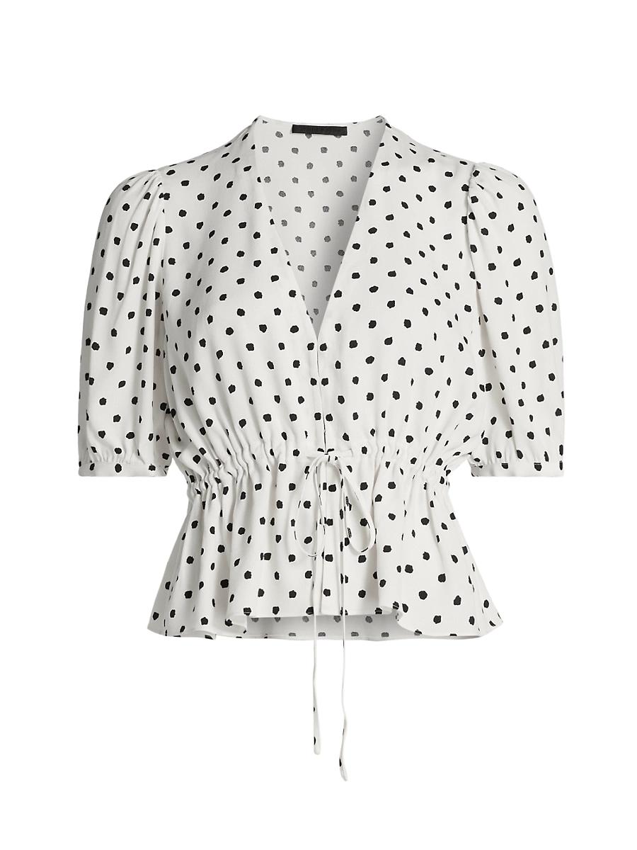 Adorned with a gathered waist tie detail and vintage-inspired polka dots, the Sawyer blouse from Jenni Kayne features a V-neck and elbow-length puff sleeves. V-neck Elbow-length puff sleeves Self-tie waist 100% cashmere Dry clean Imported SIZE & FIT About 20 from shoulder to hem Model measurements: 510 tall Model is wearing a US size Small. Contemporary Sportswear - Contemporary Lifestyle > Jenni Kayne > Saks Fifth Avenue > Barneys. Jenni Kayne. Color: Ivory Dot. Size: XL.