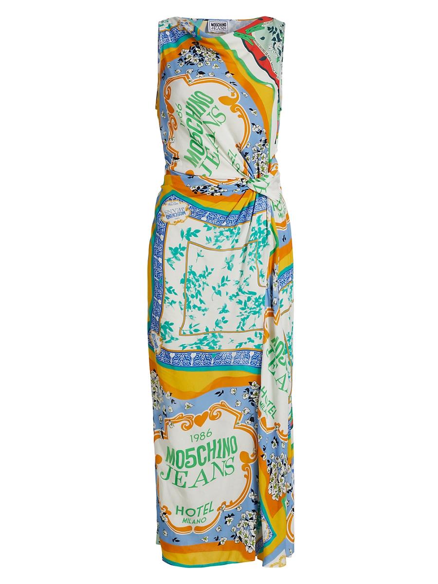This flowing sleeveless column dress from Moschino Jeans features a vibrant scarf print. The midi-length piece is designed with a cowlneck, twist detail at the waist, and side zip closure. Cowlneck Sleeveless Front twist Side zip closure 100% viscose Dry clean Imported SIZE & FIT About 53 from shoulder to hem Model measurements: 510 tall Model is wearing a US size 4. Contemporary Sportswear - Denim And Bottoms > Moschino Jeans > Saks Fifth Avenue > Barneys. Moschino Jeans. Size: 8.