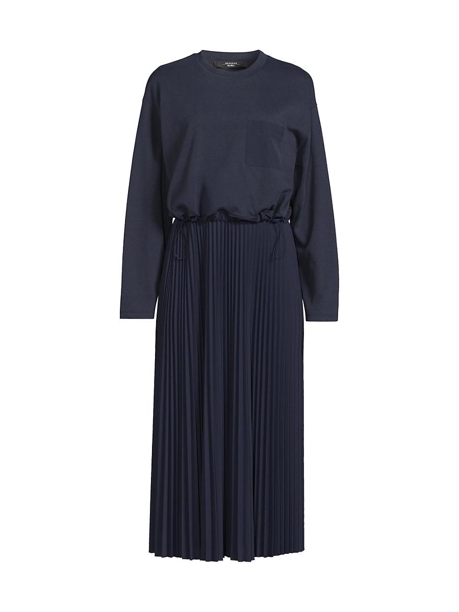 The Scatola dress from Weekend Max Mara highlights a jersey crewneck long-sleeve bodice and a pleated midi-length skirt. A drawcord waistband lends a modern touch to the style. Crewneck Long sleeves Chest patch pocket Drawcord waistband Pulls over Fabric 1: 70% cotton/ 30% viscose Fabric 2: 100% polyester Bust lining: 100% cotton Hand wash Imported SIZE & FIT Model measurements: 510 tall Model is wearing a US size Small. Modern Collections - Weekend By Max Mara > Weekend Max Mara > Saks Fifth Avenue > Barneys. Weekend Max Mara. Color: Navy. Size: XS.