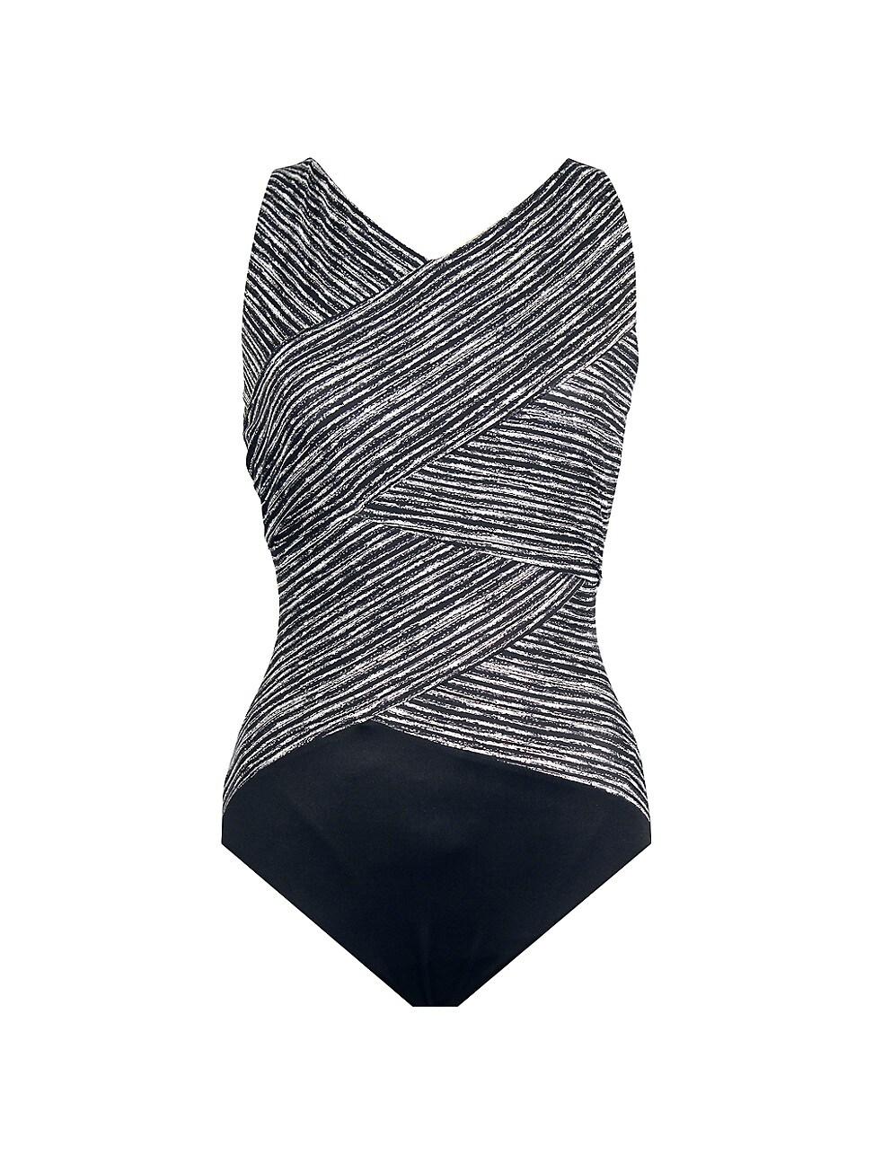 From the Selenite Collection. Look 10 lbs. lighter in 10 seconds. Miratex fabric slims and slenderizes without panels or linings for total full body shaping and control. The Brio swimsuit from Miraclesuit offers a sleek and sophisticated look with its high V-neck and cleverly layered fabric. V-neck Sleeveless Underwire bra Scoopback Pulls on 68% nylon/32% spandex Combo: 84% nylon/16% spandex Hand wash Imported SIZE & FIT Model measurements: 510 tall Model is wearing a US size 8 or Medium. Outerwear And Swimwear - Modern Swim > Miraclesuit Swim > Saks Fifth Avenue > Barneys. Miraclesuit Swim. Color: Black White. Size: 18.