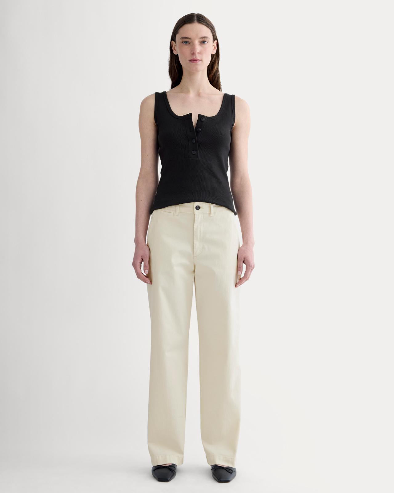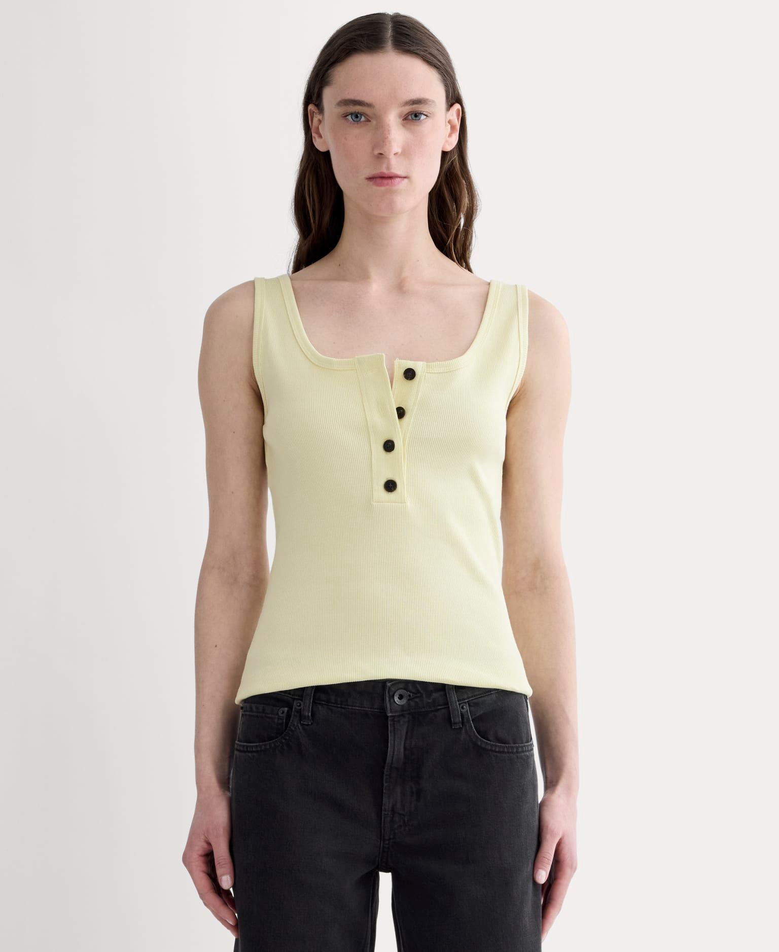 This slim-fit henley tank features a unique U-neck shape and a functional placket with faux horn buttons made from 31% recycled polyester. The ribbed fabric offers texture and comfort, while the bra-friendly design ensures all-day wearability. It's a versatile, elevated staple for your wardrobe.