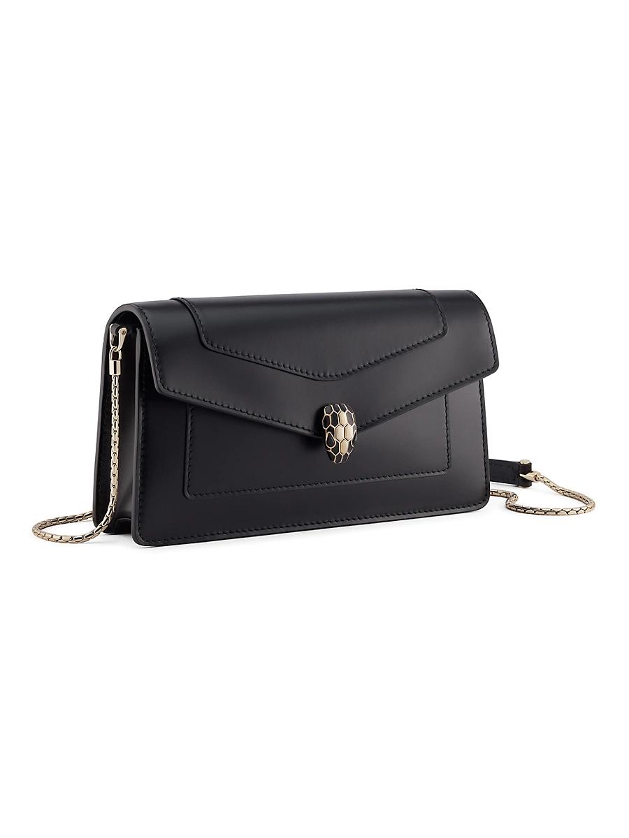 From the Serpenti Collection. Crafted of smooth Italian calfskin leather, this BVLGARI wallet is adorned with snake detailing at the chain and closure. Flap closure Six card slots, one zip pocket, one bill pocket Made in Italy SIZE & FIT About 8L x 4.5W x 1.5D ABOUT THE BRAND Founded in Italy in 1884 by Greek silversmith Sotirio Bulgari, BVLGARI has become synonymous with unparalleled craftsmanship and exquisite jewelry. The brands Roman heritage can be seen in pieces inspired by the citys architecture, artwork and ancient mosaics. Today, the house continues to translate its rich history into opulent designs and fragrances. Handbags - Italian Designers > Bvlgari > Saks Fifth Avenue > Barneys. BVLGARI. Color: Black.