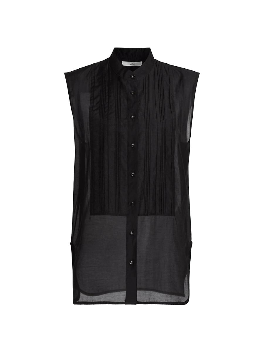 This sheer sleeveless tuxedo shirt from Co is crafted of cotton and silk. Band collar Sleeveless Bib front Button-front closure 75% cotton/25% silk Dry clean Imported SIZE & FIT Model measurements: 510 tall Model is wearing a US size Small. Designer Lifestyle - Designer Lifestyle Multi > Co > Saks Fifth Avenue > Barneys. Co. Color: Black. Size: Large.